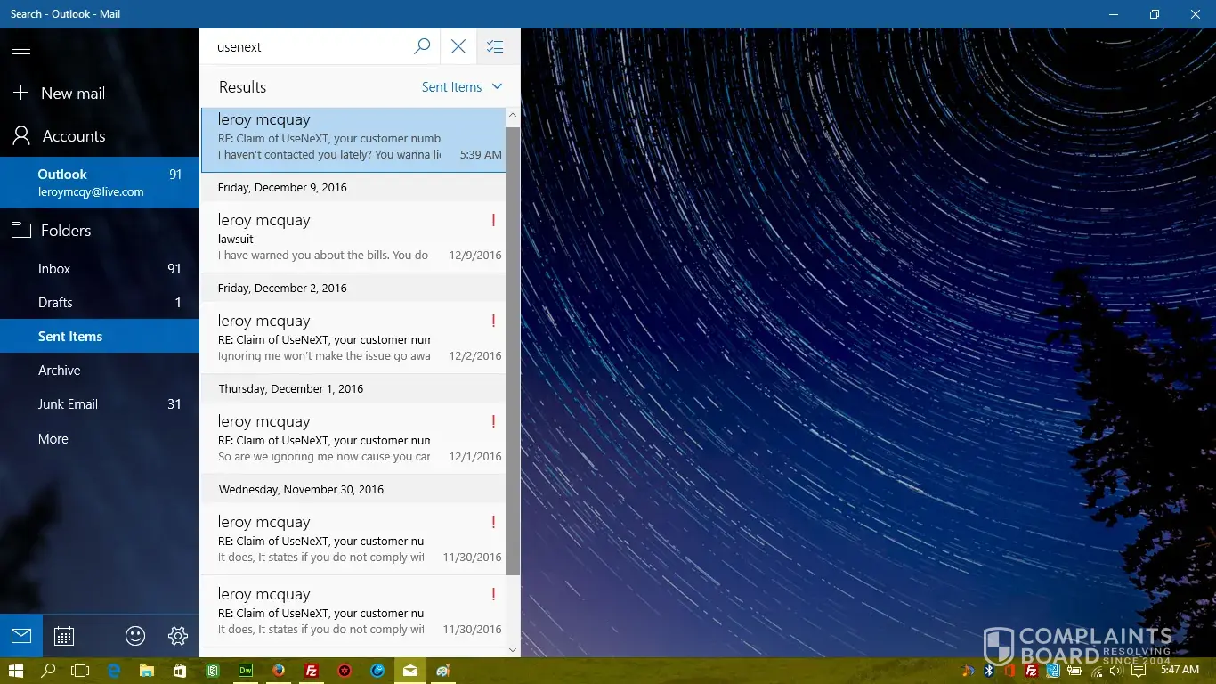 Since then, I have been receiving threatening emails telling me that if I don't pay the amount requested, that UseNext will send my account to a collection agency. I have responded twice with the documentation proving that I have cancelled my account but I never receive a response. Only the threatening emails about the debt collection.