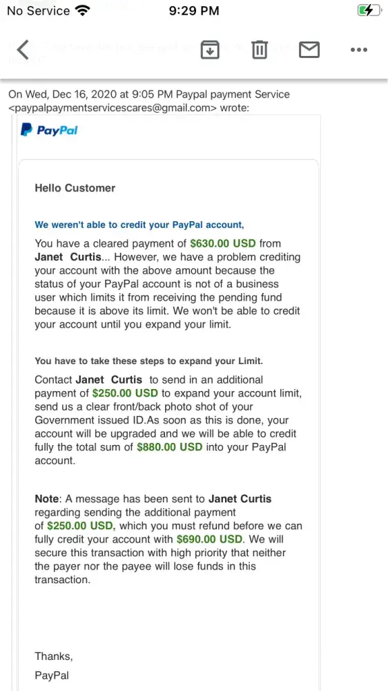 Yes I was saleing my IPhone 11 on Facebook market when a lady by the name of Janet Curtis inbox and was looking to buy she sent me a fake email from PayPal wt a pending deposit of 630.00 dollars that's when I ship my iPhone 11 to suit [protected] me 79 court Portland Oregon 97218 from Clinton Township Michigan only later to find out usgobuy had fraudulent took my phone without depositing my funds to my PayPal account. Please I'm begging u guys to me with this matter