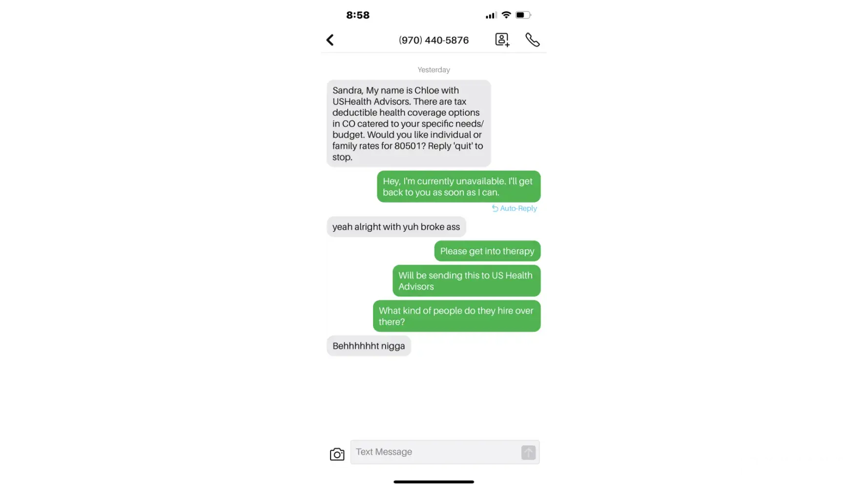 I am receiving text messages from a Chloe with US Health Advisors... this person has sent me text messages that are threatening, racist and condescending. I will be taking this information to BBB and to the police to file a harassment report.