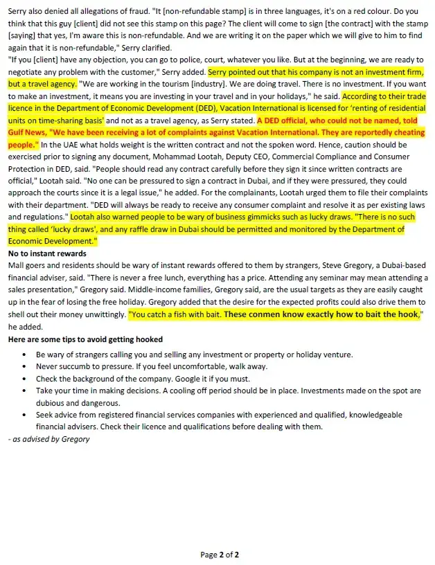 Please refer attached 2 image files, Gulf News Article about "Vacation International - Cheating"