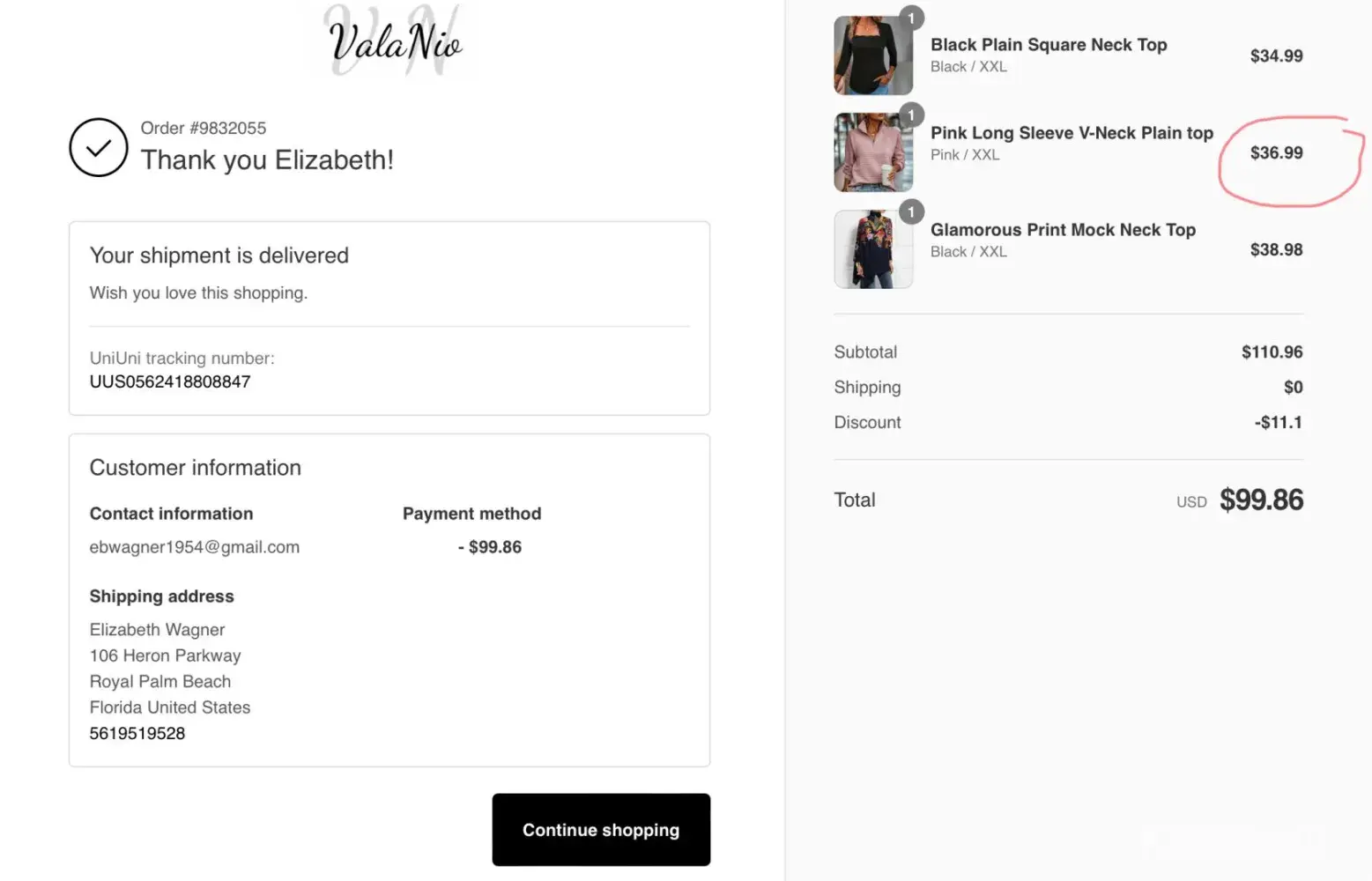 I made an order on Valanio's website on November 10th. I was excited to receive my purchase, but unfortunately, I encountered some issues. On November 25th, I received an email stating that my order had been shipped. However, when I tried to track my package using the USPS tracking information provided, I couldn't get any information. It's been frustrating not knowing where my package is or when it will arrive.