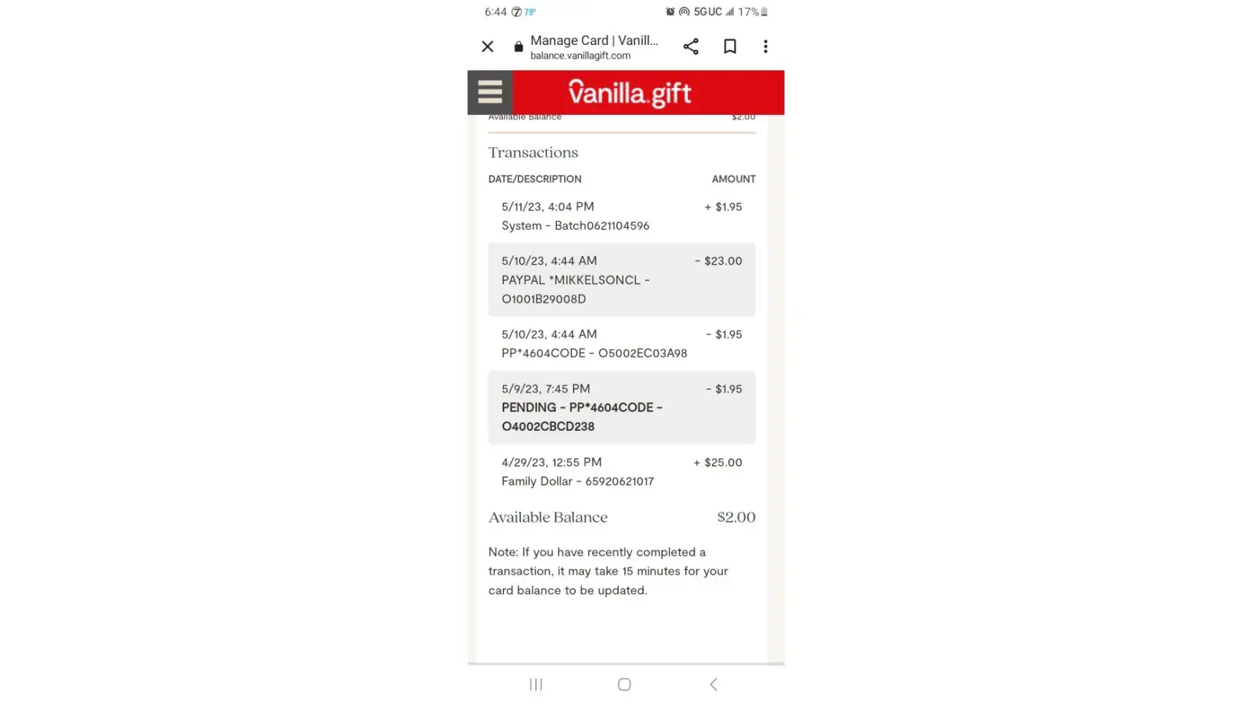 After I put the card information in there, it told me that the card was not valid. So I tried a different website and I put in the card information and it then led me to my available balance of $428.27. I then tried to make a payment on Etsy and my card was declined. I went back to the Vanilla website and it said that my balance was $0.00 with multiple charges through Pay Pal. I do not even have a PayPal account. I have been trying to get in touch with the credit card company at the number provided on the back of the card for hours now with no response from their customer service. The PayPal charges are still pending.