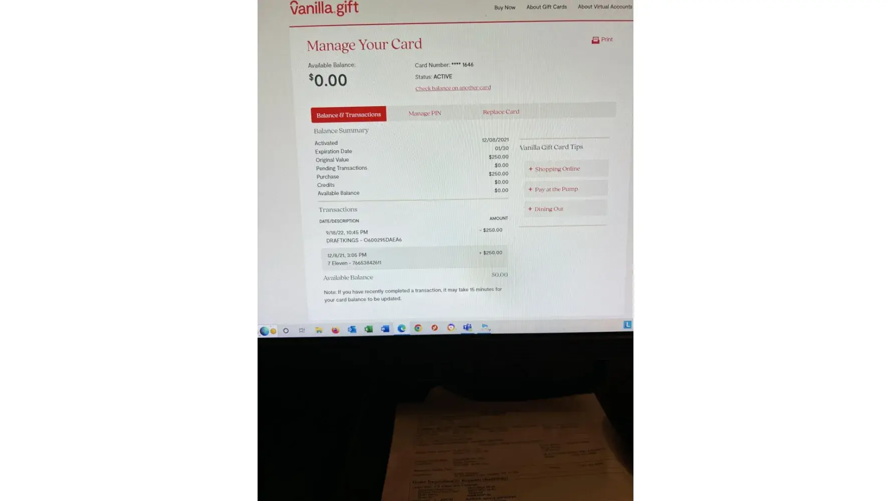 I was given a Vanilla Gift Card back in December 2021 in the amount of $250.00. I just took it out of my safe to activate it and it states there is 0 balance on the card (it has NEVER) been used, and a charge for $250.00 was processed on 09/18/2022 to Draftkings. AGAIN-this cared was NEVER activated until I just went to do it. I would like a complete refund.