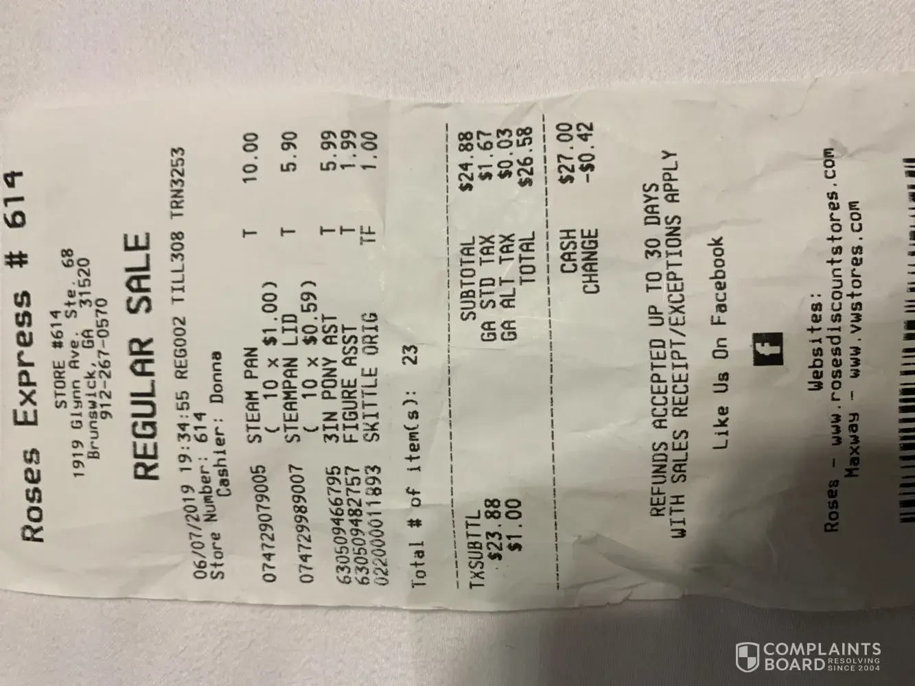 I visited Roses in Brunswick, GA and the manager would not honor the price on toy. It rang up for a different amount. When asked if they could honor it she was very rude and said no. It was a small Toy and I felt she could have been nicer and honored the price tag on toy. It was not my mistake. I still purchased toy but was unhappy with customer service provided. The manager Donna at store #614 needs lessons on customer service. This was an inconvenience to me. I am attaching pictures of the toy itself and my receipt of purchase.