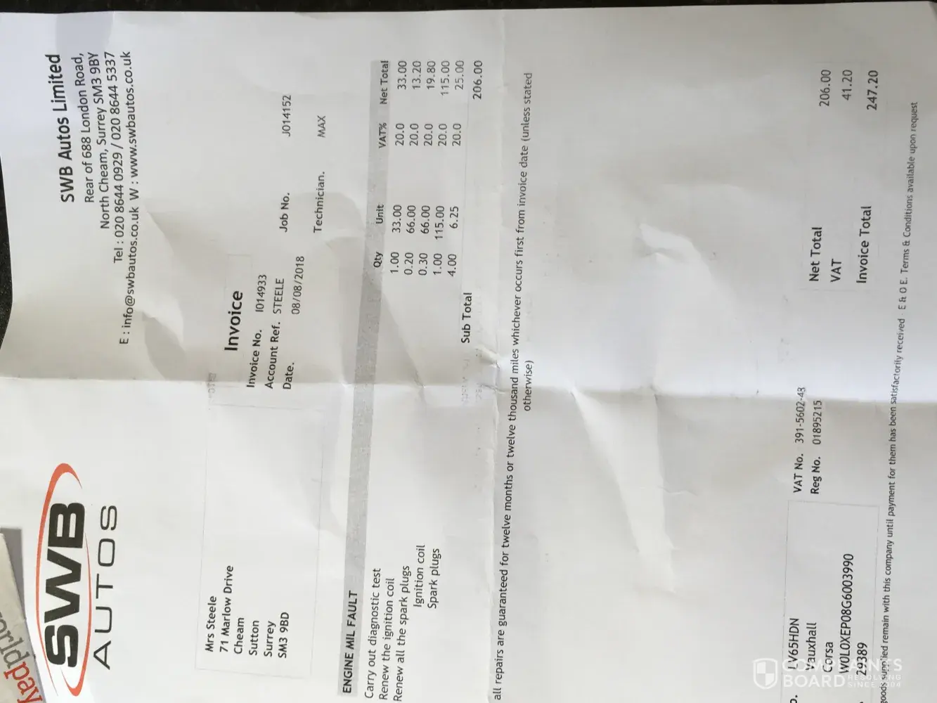 I was driving to work on Tuesday 7 August 2018 and the Electronic Stability Control And engine management lights come on. When I got to work I rang Vauxhall in Epsom (my local Vauxhall and the one I always use) to ask if I should be concerned about the light, I was told they wouldn't know until they looked at the car. When I asked when they could look at the car I was told not until September. I was advised to keep driving the car until the light eithe went red or the car broke down and I could be towed to the garage as they might be able to look at the car sooner than September . A bit concerned she repeated her advice. Feeling worried I rang my local garage, SWB Motors in Cheam who looked at the car the same day, told me not to drive it as it would cause further damage to the car. They diagnosed the problem as as faulty ignition coil and repaired it on Wednesday 8 August and it is fine now (£247.20).I am horrified at the lack of service from Vauxhall - the car is under warranty until September but I had no choice but to get it done elsewhere. I attach my receipt for the work and trust Vauxhall will reimburse me.