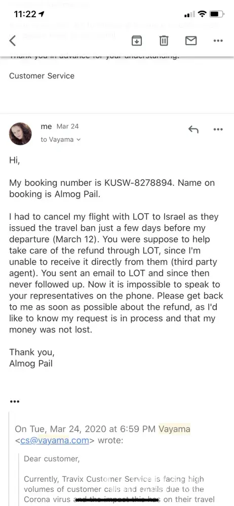 I took screen shots of twenty or so times I contacted Vayama since the middle of March 2020.