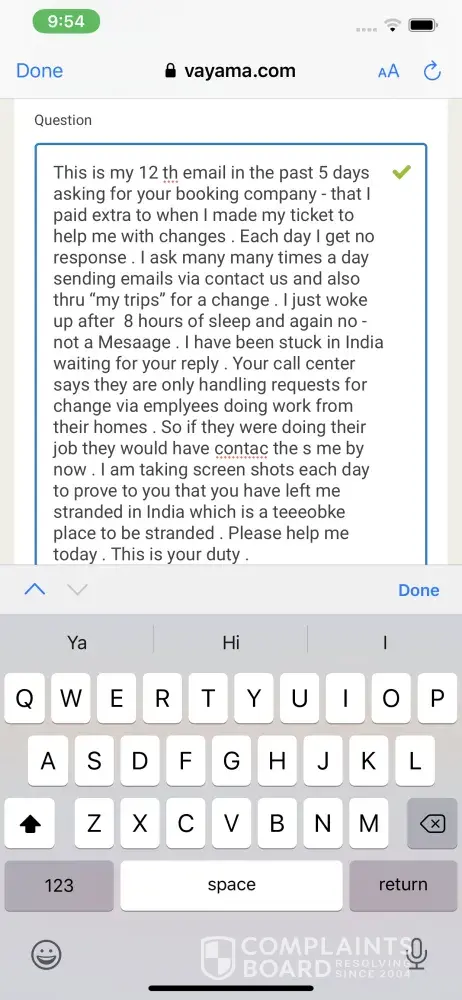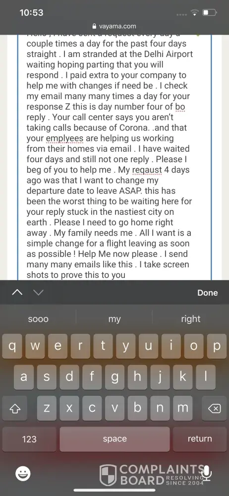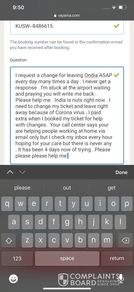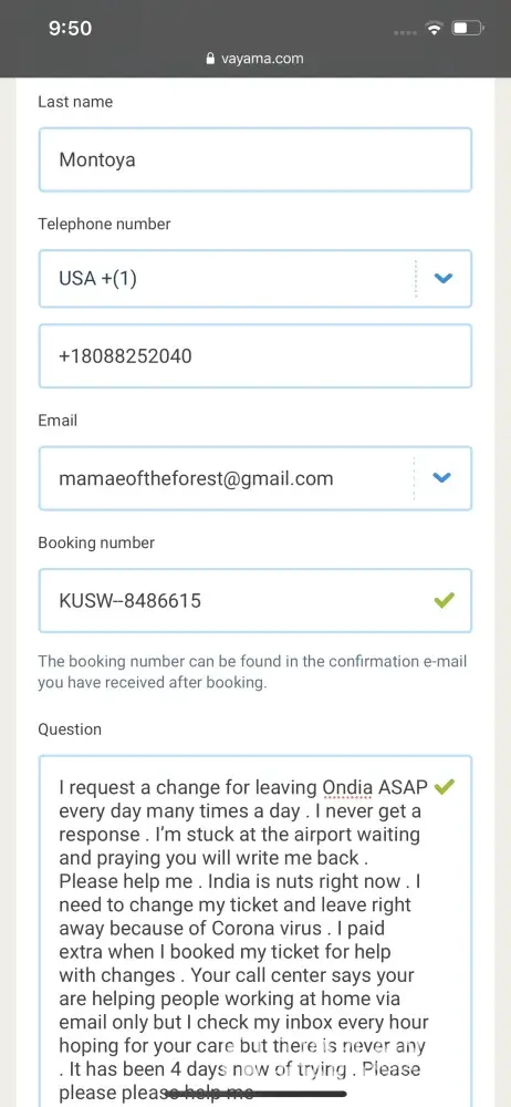 Vayama is not answering calls or emails. I have been trying for 4 weeks to reach them to change or cancel my flights. I'm one week away from my travel date and no response from the various emails I sent them. The airline is letting people change or cancel flights but I can't make the change through the airline. I have a doctor's note that says my son cannot travel due to health conditions. I need a call from Vayama to take care of this. Booking number: VUS-[protected]. Customer Support: [protected]@vayama.com; Feedback: [protected]@vayama.com