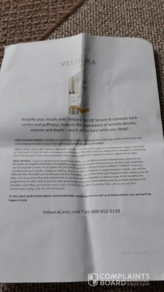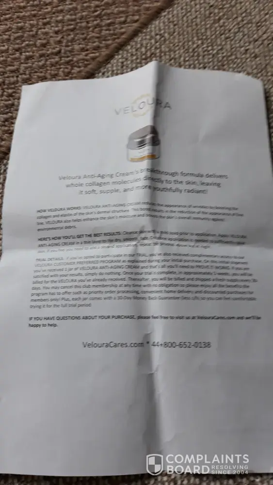 I answered an advert for a free sample of anti-ageing cream just before christmas, I do not recall where I saw this. The cream did arrive and also a tube of eye cream which I had not asked for. I was told that I had to pay £4.99 for postage, which I did on my credit card. My credit card company have told me that there has been 2 payments of £4.99 taken in december and also an amount of £89.99 and £79.99 taken on 1st january. I understand the term free means there are no costs. There was a letter with the cream which gives details about a trial which says that once your trial is complete they would bill me for the veloura which I had already received, and thereafter would be billed every 30 days. You may cancel this club membership at any time. The advert did not explain any of this. I have tried to phone the number 44 800 652 0138 which is not recognised. There is no address given. This is obviously designed to trick people.
