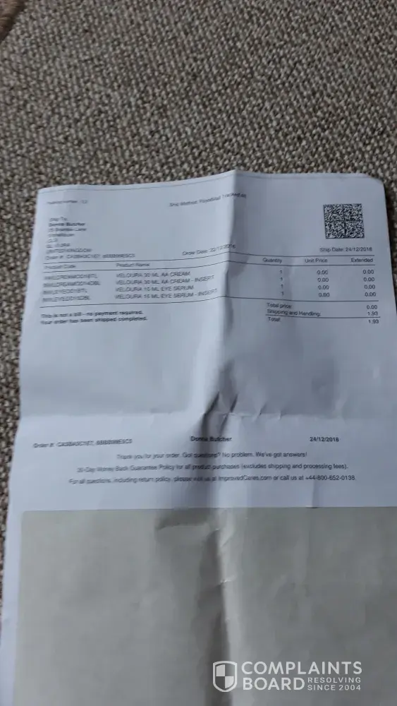 What can I say. Ordered in good faith anti ageing cream for 4.99 and then had a phone call to say I should have the serum for 1.98 postage only. The items came BUT with paperwork mentioning a trial and when emailing you I was shocked at the prices. This was never explained to me at ordering.