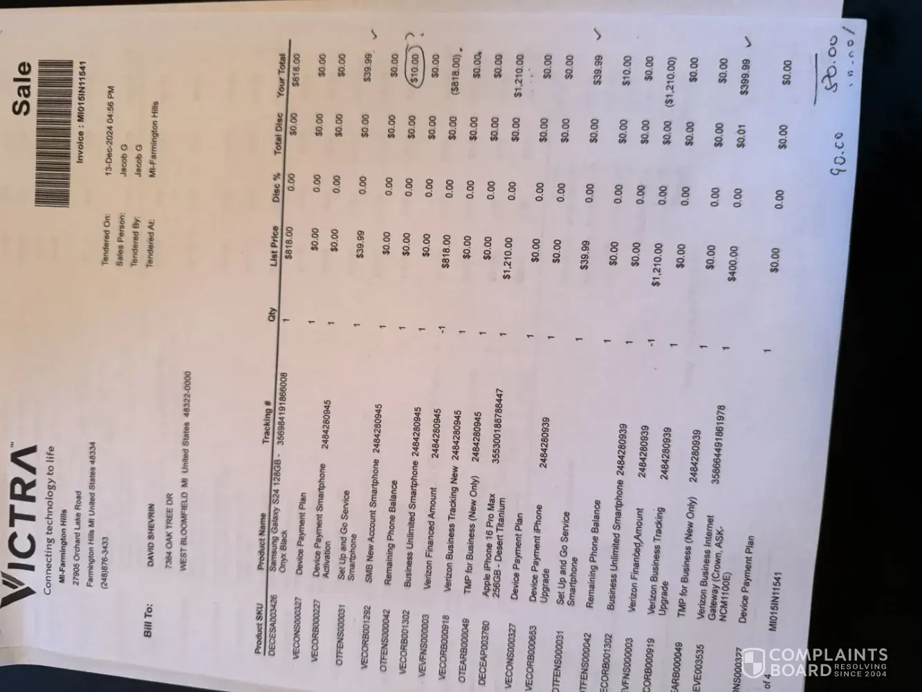 On 11/29/24 (Black Friday) I went to a Verizon Store at 27905 Orchard Lake Rd, Farmington Hills, MI 48334 & signed up for 2 new Business lines, WiFi service w/ gateway & purchase of an S24 & i16 Pro Max. As part of the Black Friday promotion they gave me $800 and $1,200 respectively in devise credits for the full value of both phones w/ 2 valid trade in...