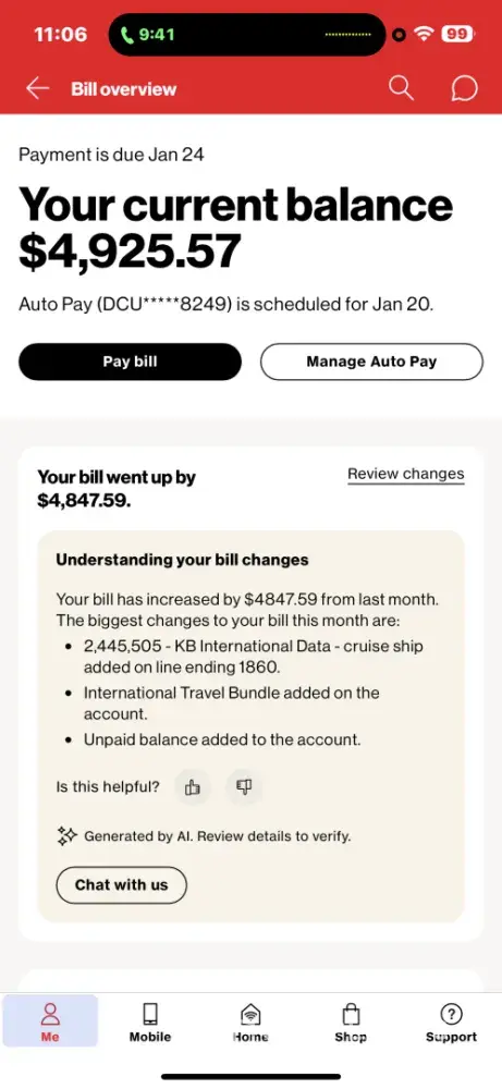 Claimed loss: Paid $388 in October 2025 which was incorrect. Verizon agreed to waive my international calls while I had the international plan. They owe me approx $188 in erroneous charges.