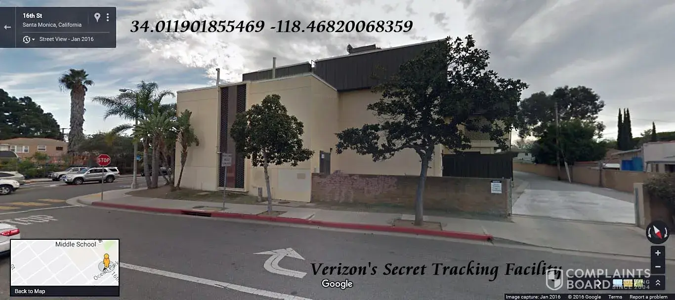 Enter into Google Maps 34.[protected] -118.[protected] and view Verizon's secret tracking facility in Santa Monica California, which tracks their users web-surfing habits by using their wireless phone email account address, when users use their laptops or personal computers.