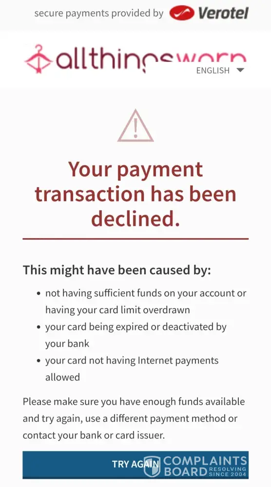 I am an Australian selller unable to process a payment for a one month premium on allthingsworn.com. I have used my husband's Westpac bank card and 86400 bank card, which has sufficient funds and is able to be used for internet purchases. Allthingsworn.com stated it is a Verotel issue. I've tried contacting Verotel with no luck.