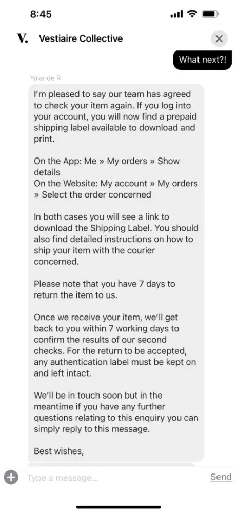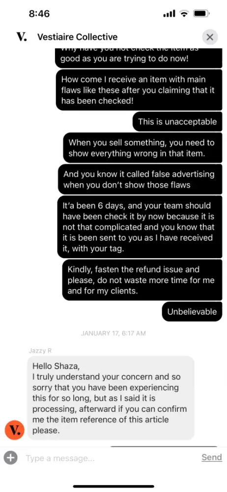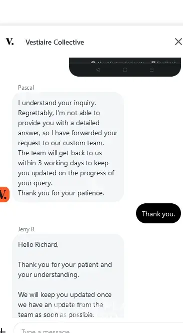 I trust that Vestiaire Collective will take prompt and appropriate action to address this issue and restore confidence in its platform. I eagerly await a favorable resolution and request timely communication regarding the progress of this matter.