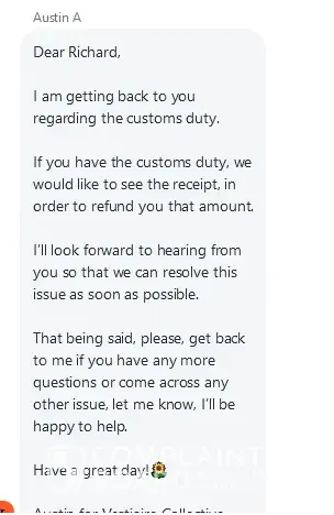 I left a review on trust pilot and the response said that they would get back to me about the customs charge - but they never did.