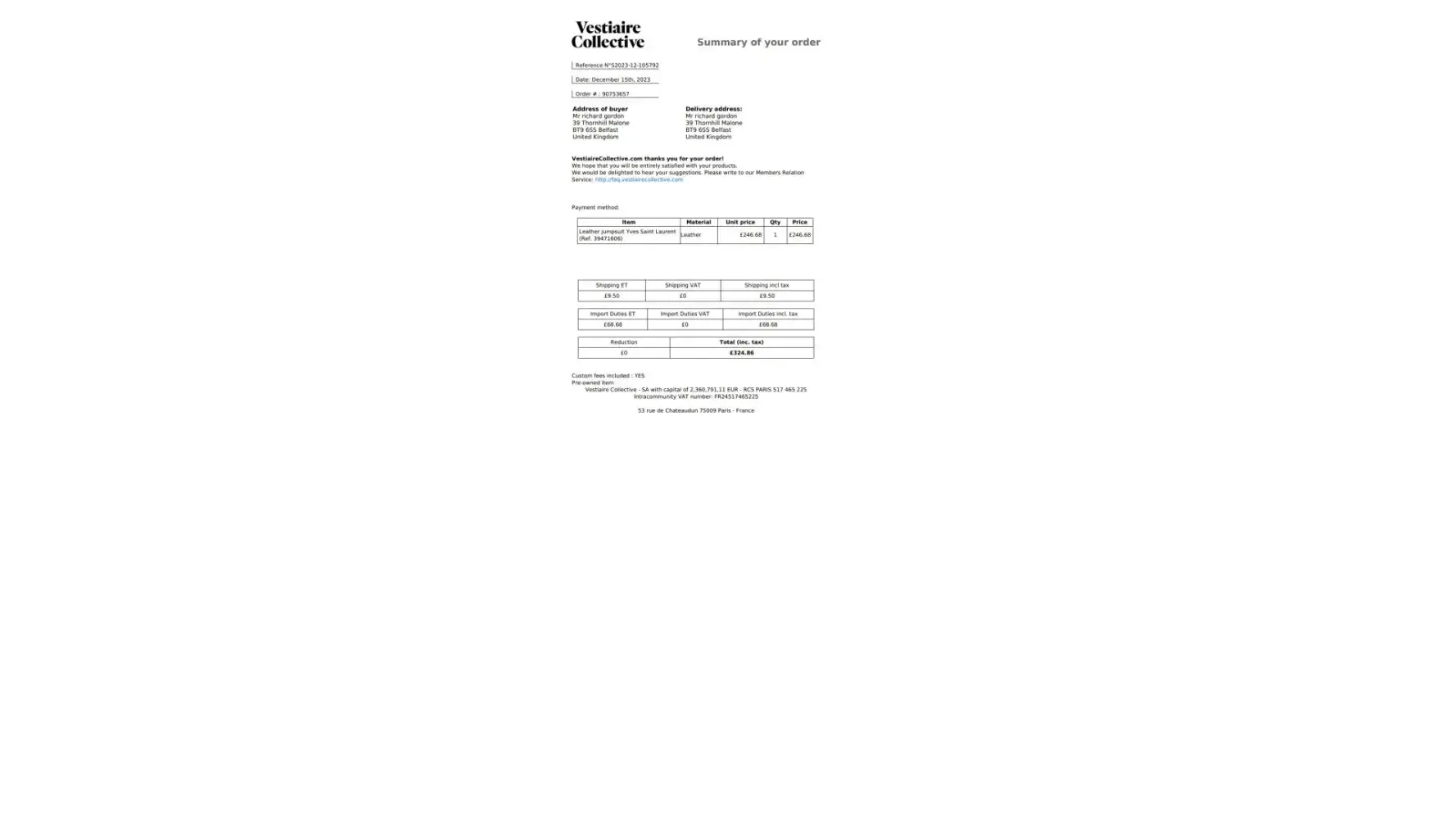 I am based in Australia and recently bought an expensive vintage watch from a private seller in England through Vestiaire Collective. Having read many reviews, I was very apprehensive about the company but I am pleased to say I am impressed with how the transaction was handled. The seller was very helpful, keeping me updated throughout the process until the item left VC in France. I also made sure to keep in touch with VC that everything that the seller included in the original package was included as I had read about some bad experiences people had had previously with missing packaging, documents etc. Every time I got in touch with VC, I received a response to my question within 48 hours and a survey subsequently asking for feedback on their customer service; perhaps a sign they are reading some of the negative reviews on websites like this and trying to do better... It did take about 7 weeks from purchase to receipt of the item, however most of this was due to the logistics companies making errors. I was also concerned who would be responsible if the watch was lost during transit and found no answer on the site; upon asking VC however, I was told they have insurance policies in place to cover this, just in case anyone else was wondering! It may be that my queries were prioritised due to the high value of my purchase; however I found VC to have acted and communicated consistently throughout the somewhat long process and would buy through them again.