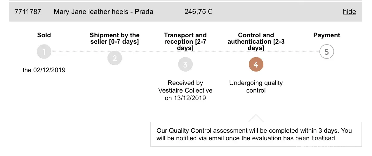 I have successfully sold a few items with Vestiaire Collective. Until recently I have sold an item and sent it on time. ONE MONTH has gone and the item is still under quality control! I've tried to send numerous emails and call customer service to request to speak to the higher team. However every time they only give me standard answers and apologies like reading from a script but without actually solving the problem!