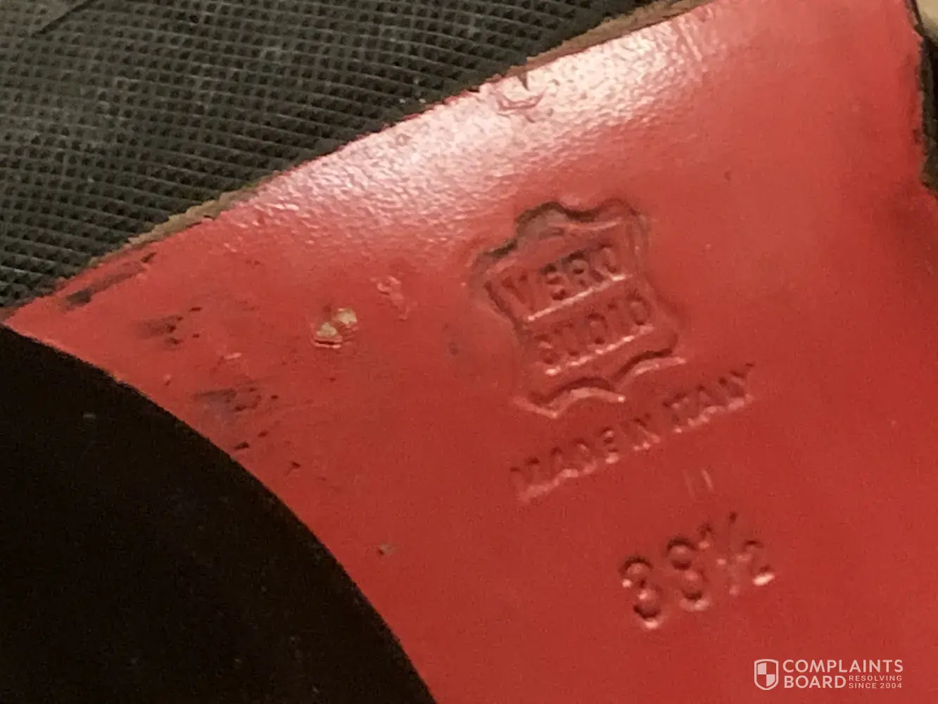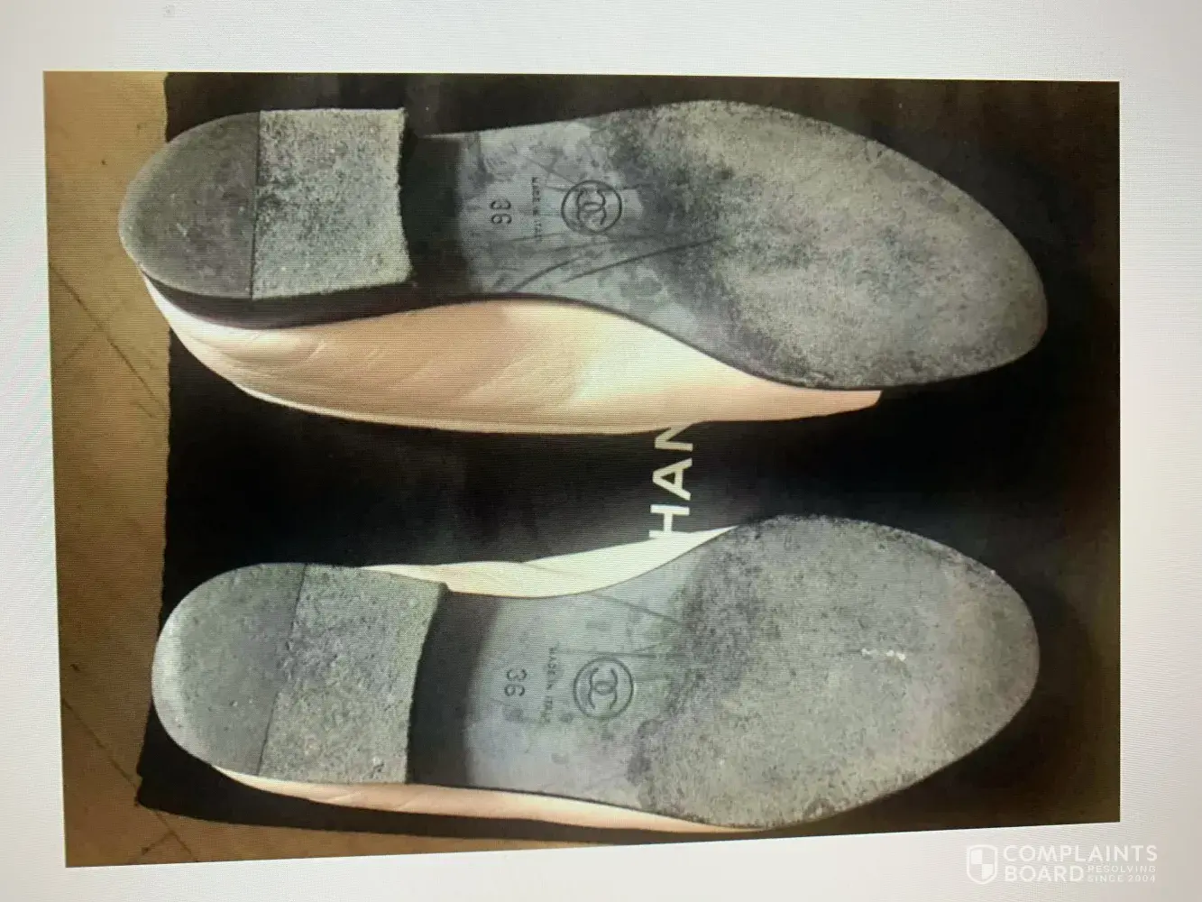 The first image is what i received and the second is what was advertised. These are two different shoes (in first photo). The left shoe's sole is a different texture, color, and the "made in italy", Chanel logo, and size that's emblazoned on the shoe is different. They're also different sizes; my left foot (which is naturally smaller than my right) hurts when I put the left shoe on while my root foot/shoe is completely fine. The company thinks there's no real difference between these shoes, that the sole was just cleaned with a "wet towel" and refuses to allow me to return the shoes despite them clearly being different than what was advertised, and despite the left and right shoes that I received clearly being different.