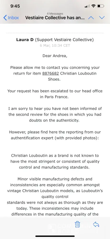 I bought a pair of Louis Vuitton shoes from Vestiaire Collective that were supposed to be authentic but when I revived them they did not appear to be authentic. I was told to send them in to have them