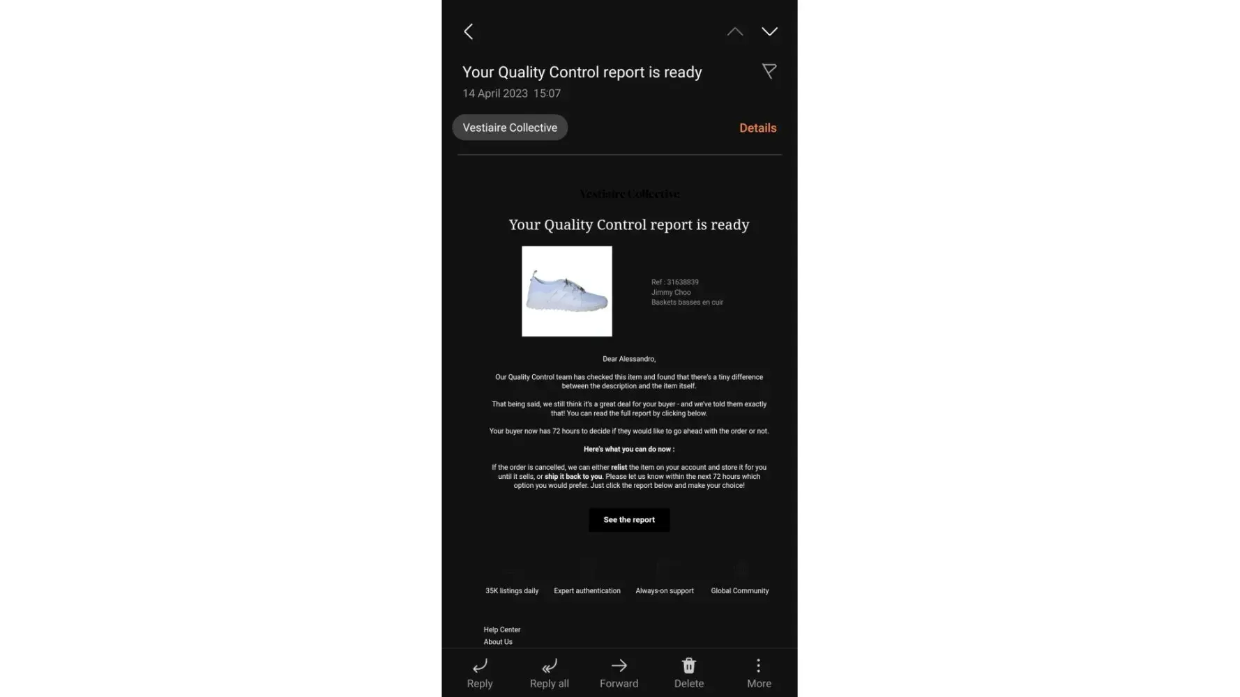 I bought and paid for an item on 8 March which has been lost in the post. Vestiaire tell me they are awaiting a response from the courier. It is their responsibility to refund me irrelevant of the courier investigation. Warning to everyone, most Vestiaire purchases end in a problem. Customer services is the worst I have ever experienced anywhere! They do not care about their customers at all. Avoid these cowboys or take a massive risk on loosing your hard earned money. I would not recommend to anyone.