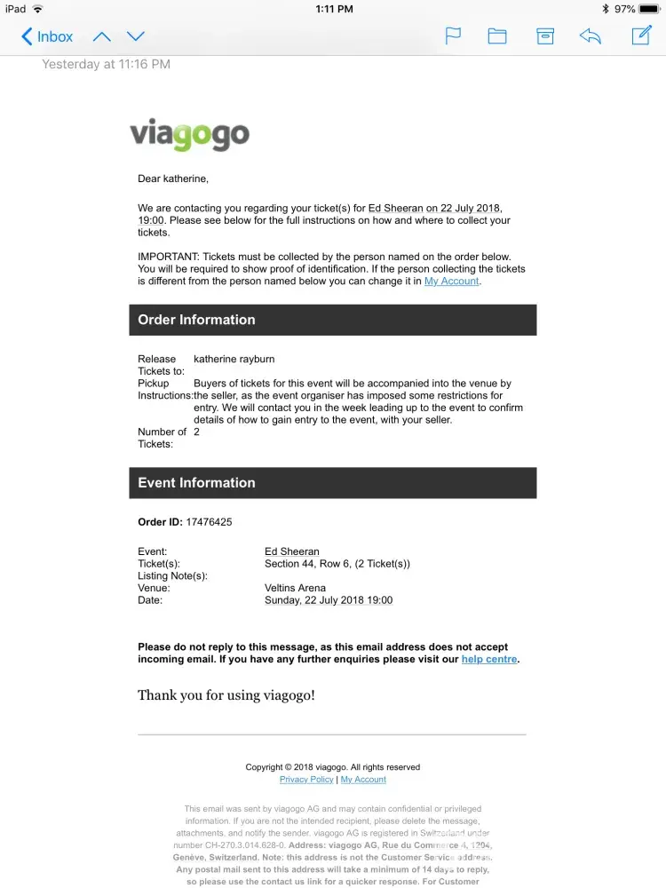 I sent multiple emails to Viagogo's customer service and received confusing responses. A number of my inquires were not attended to.
