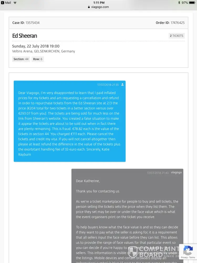 Once I discovered this information I opened a dialogue with Viagogo to express my concern that I had been misled, every communication I have had with the company has generally been a cut and paste of an earlier email though I have heard that I am lucky to have had a response at all. I am upset at the overcharging and being ripped off but I accept that I did not do enough research. However, they have failed to comply with their own terms of sale as they are offering "instant download" tickets knowing that they are not going to provide this service. They will not give me seat details so I am unable to check if this is a valid sale.