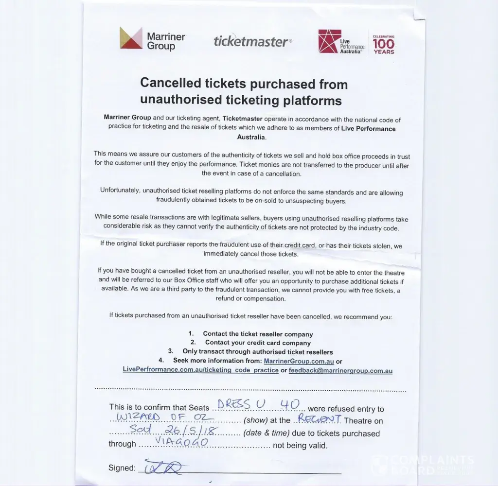 I was dubious about them from the beginning as heard viagogo tickets we a scam after purchase. I ran ticketmaster, where the tickets came from and they said they were real tickets but had probably been on-sold many times. I went to the concert with my 11 yr old son as a special treat for him. We were rejected at the door saying we needed a refund. I was been trying to get hold of via gogo numerous times, the ph numbers are disconnected and when you email them it just takes you round in circles and no one responded.