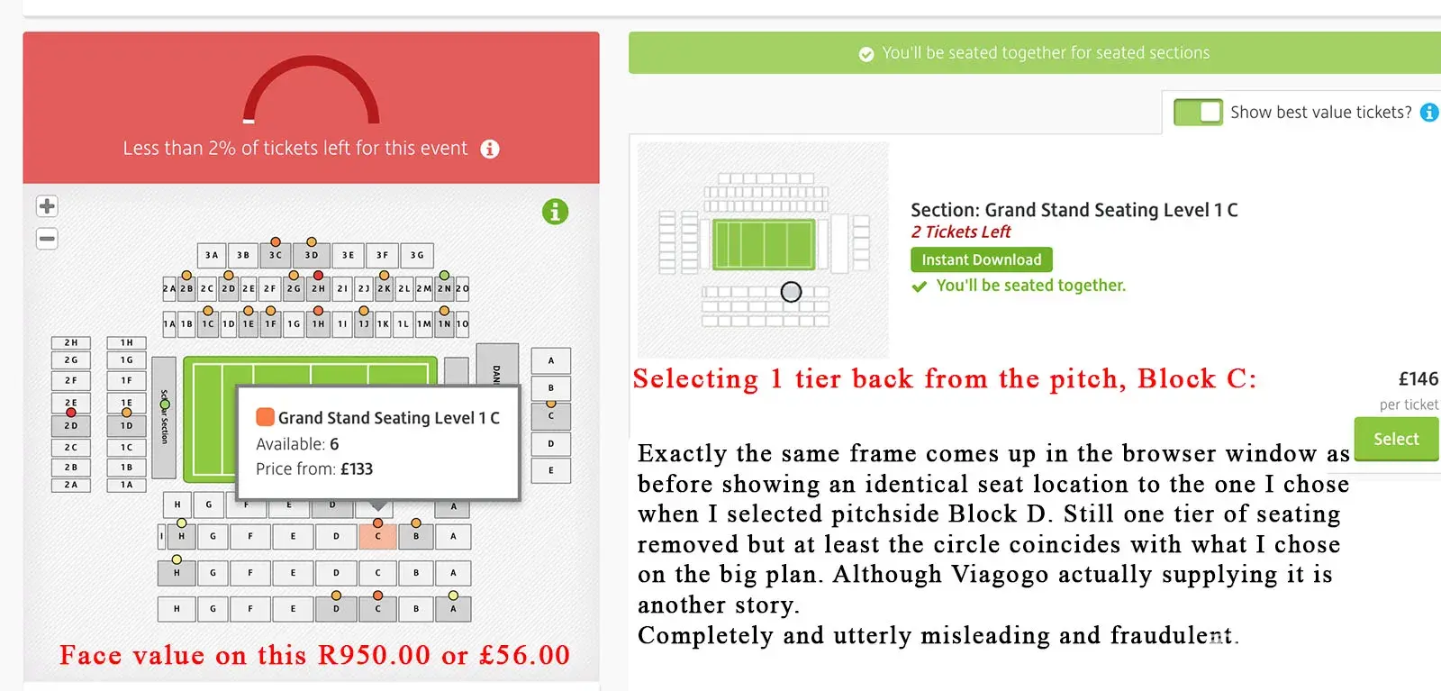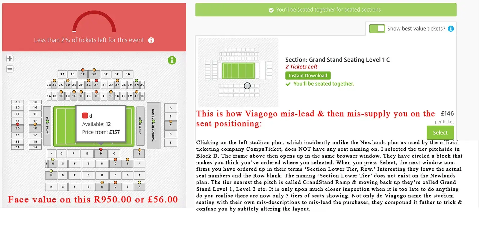 Join the club; I ordered up pitchside between either 22 Blocks C to F at Newlands. 10 weeks later when I was told I could download them, they've supplied me 1 tier back up in Block H which is over the tryline. 3 weeks of messaging to these shysters has go me nowhere. I've been interviewed on Cape Talk Radio and opened up a fraudulent selling case with my credit card company in the UK. Nevermind the obscene over charging involved. They are utterly fraudulent con-artists who have lawsuits against them around the world.