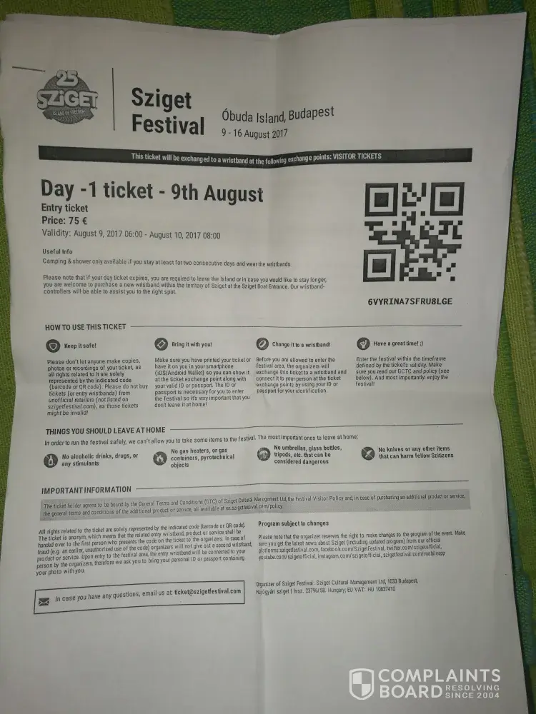 I bought 5 day pass ticket for Sziget festival starting 11th August to 16 August in Budapest, however when I came to festival place, i could not enter since the officials explained my tickets are invalid, we checked the barcodes from scanner many times but it did not work either. I could not enter to the event. I travelled miles from my country for this event and could not enter, bit disappointed.