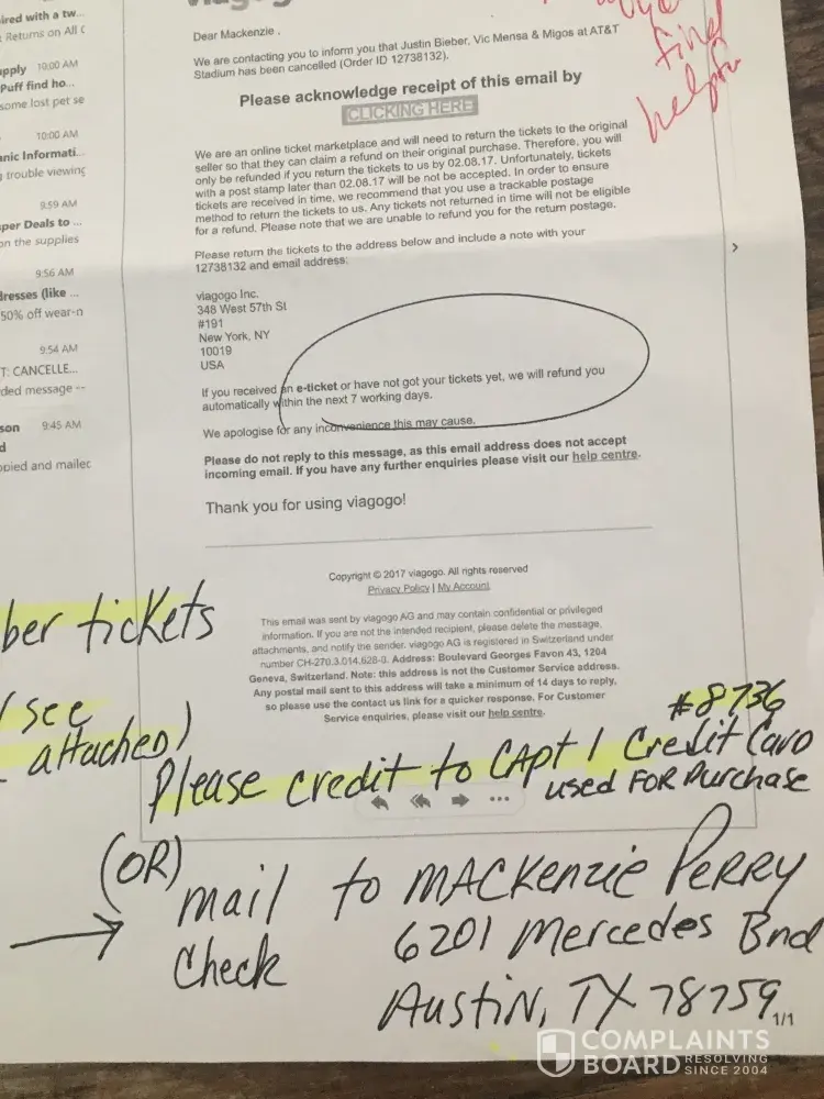 Received email from Viagogo on Jul 26, 2017 stating Bieber concert in Dallas, TX was cancelled and to federal express original tickets by 8/2/17. Instructions on email stated to federal express original tickets back to them by 8/2/17 for refund. I understood that