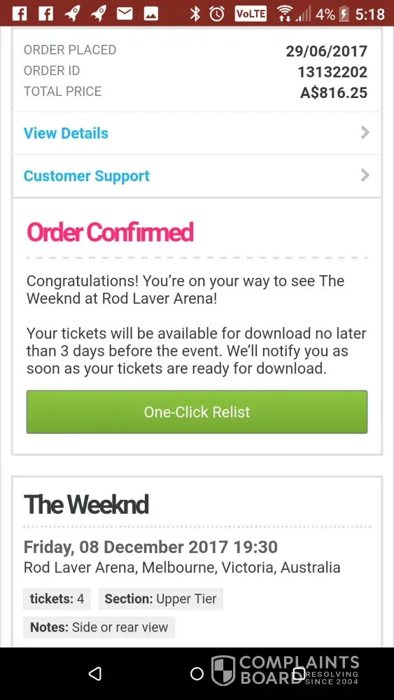 I purchased 4 Tickets to The Weeknd Concert in Melbourne, from Viagogo.