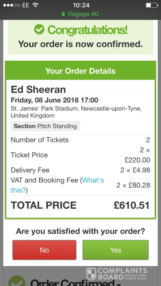 I have recently purchased Ed Sheeran tickets and am concerned about the misleading information which appears to breach the Consumer Rights Act. I am also concerned that my tickets won't be accepted on the door. My reference no. is [protected]. I would like to speak to a Viagogo representative within 24 hours or will take this complaint further. Thank you, Mr D M Jardine.