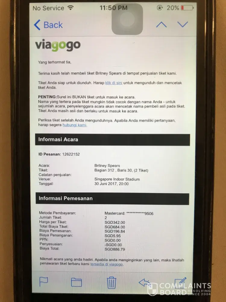 Dear Viagogo i purchased the tickets for britney spears concert in singapore and order e-ticket. My booking number : [protected]. And when i enter to stadium they said my ticket already taken and because of that i need to repurchased another ticket. So my tickets from viagogo is avoid and denied cause can't be scanned during the show. I need clarify and confirmation about my booking and lost total SGD 886, 79. Please do give me answer and ASAP. I already declare police report to user that sells me tickets on viagogo.