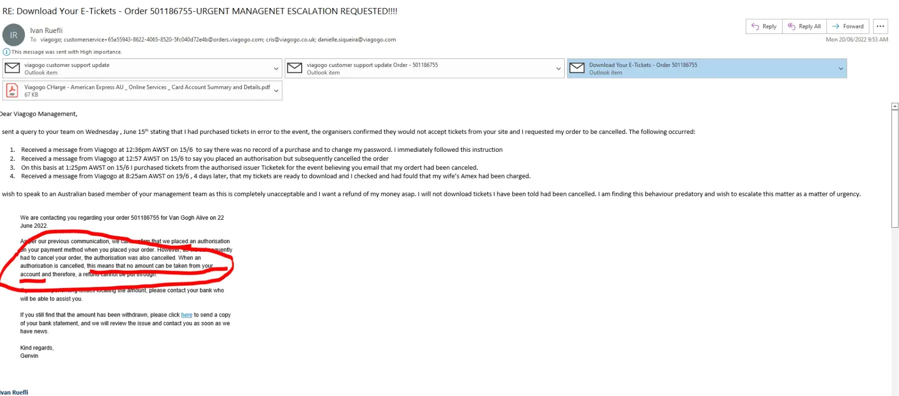 2. Received a message from Viagogo at 12:57 AWST on 15/6 to say you placed an authorisation but subsequently canceled the order