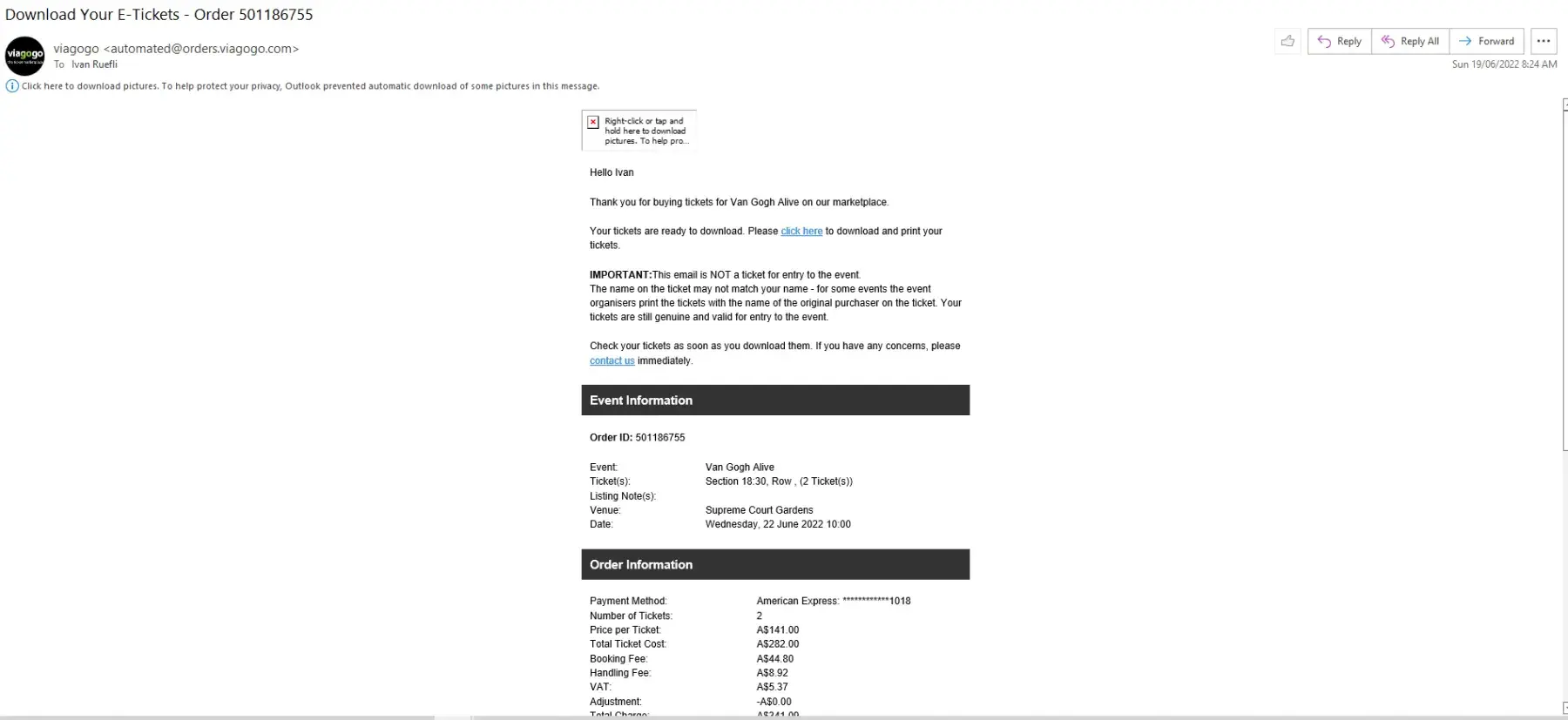 4. Received a message from Viagogo at 8:25am AWST on 19/6 , 4 days later, that my tickets are ready to download and I checked and had found that my wife’s Amex had been charged.