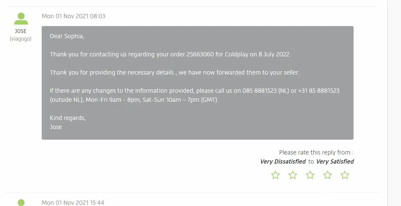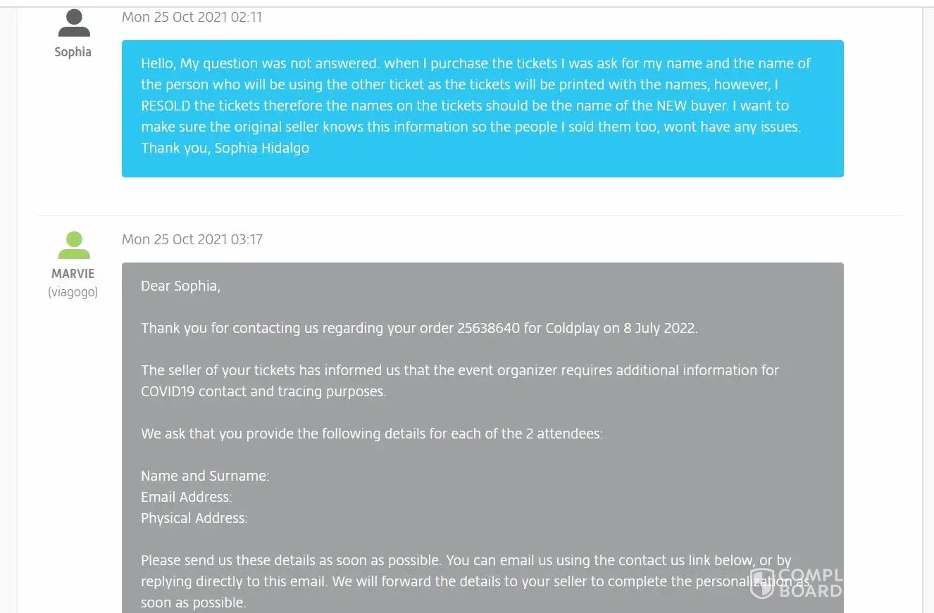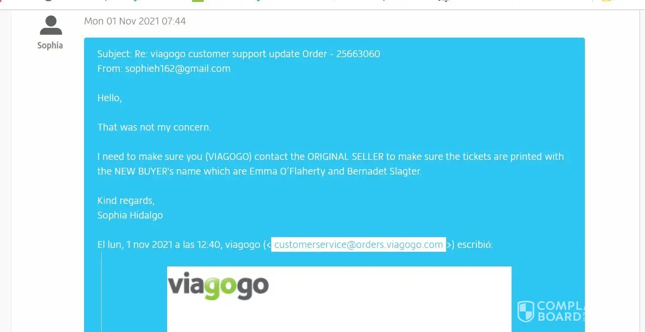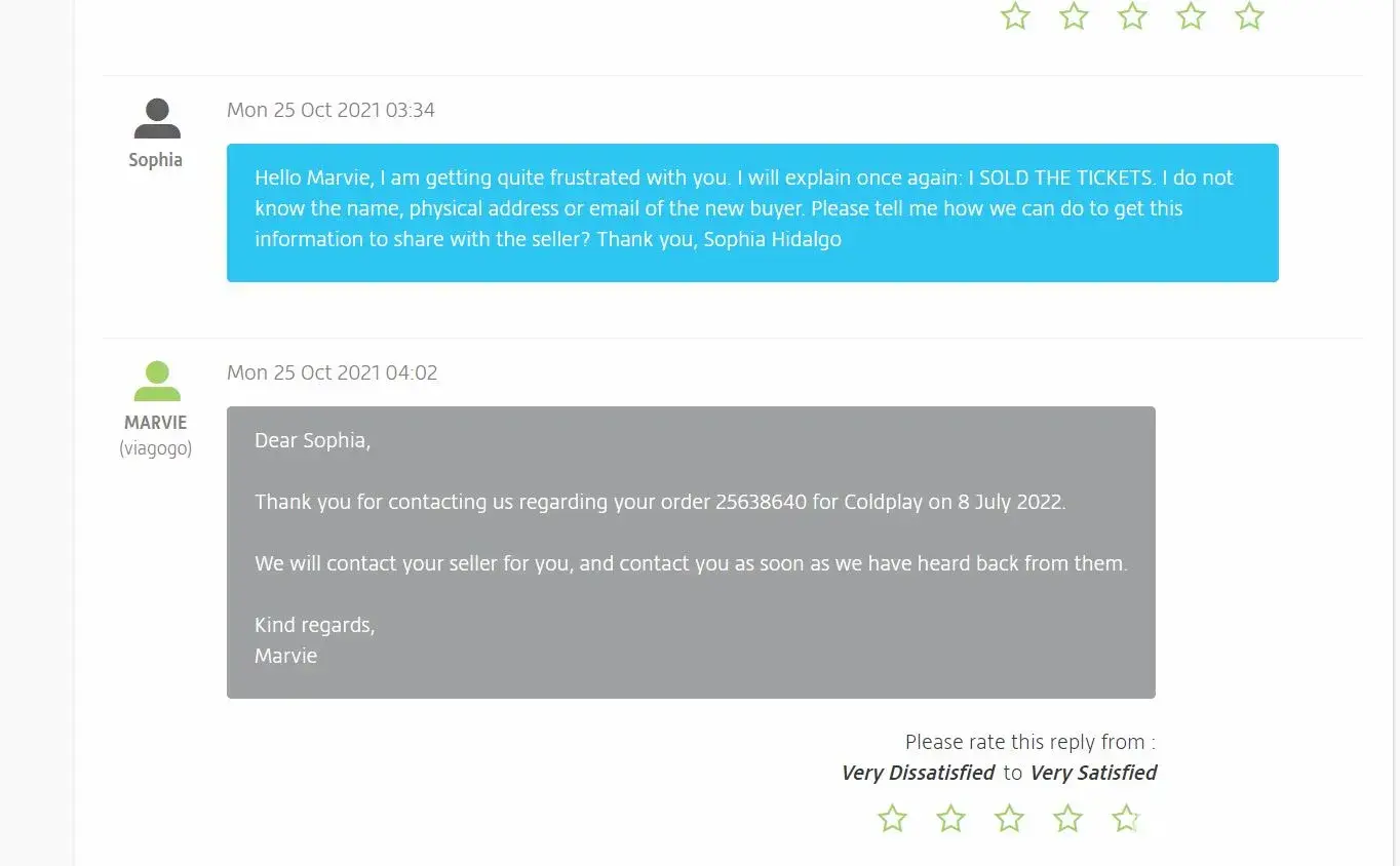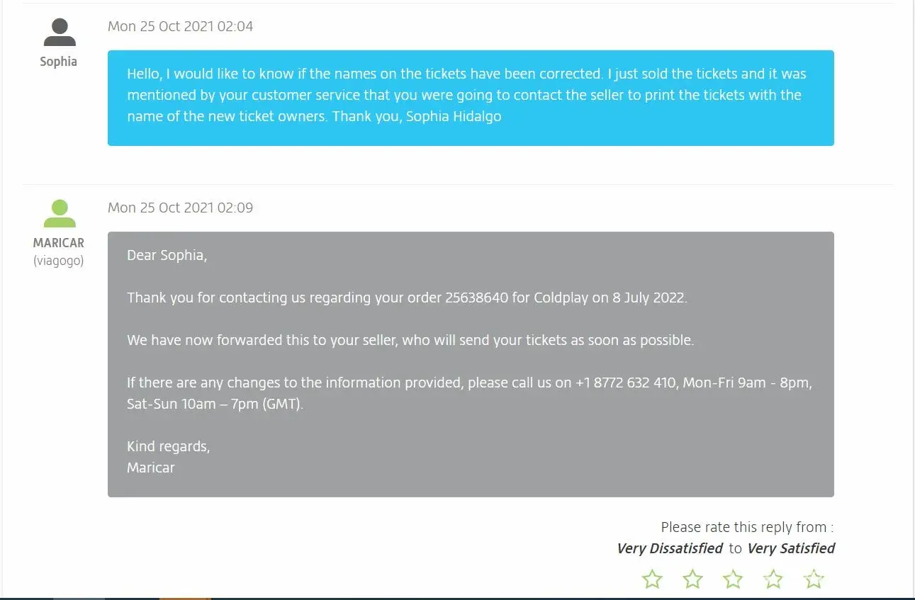 Since then, I have been calling and emailing several times Viagogo to make sure the names on the tickets were changed to my buyer's names. And I received confirmation from Viagogo that they forwarded this details to my seller. Viagogo did not want to provide me with my seller's contact information, so I could only request the changes to Viagogo so Viagogo could contact my seller.