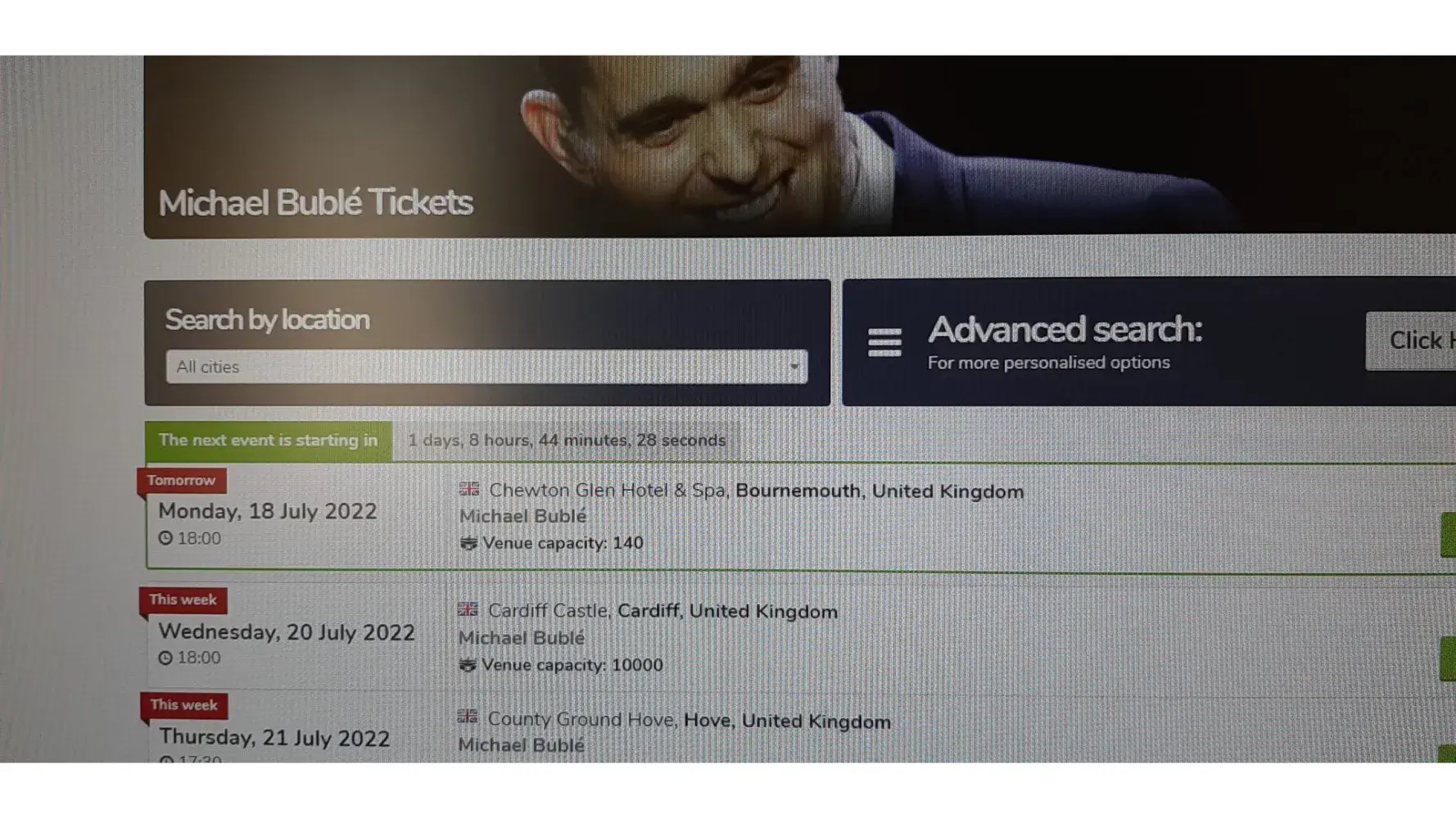 We were sold tickets back in 2020 to see Michael Buble at the Chewton Glen, England, now re-scheduled for tomorrow the 18th July 2022. This is still being advertised on Viagogo as a capacity of 140 people!. We have paid over £700 for these Gold Circle tickets, only to find out yesterday in our local paper that the event is actually for 14,000 people and it's not actually at the Chewton Glen, a beautiful prestigious hotel, but in an adjoining field.! We have totally been mis-sold these tickets and paid a lot of money for them.