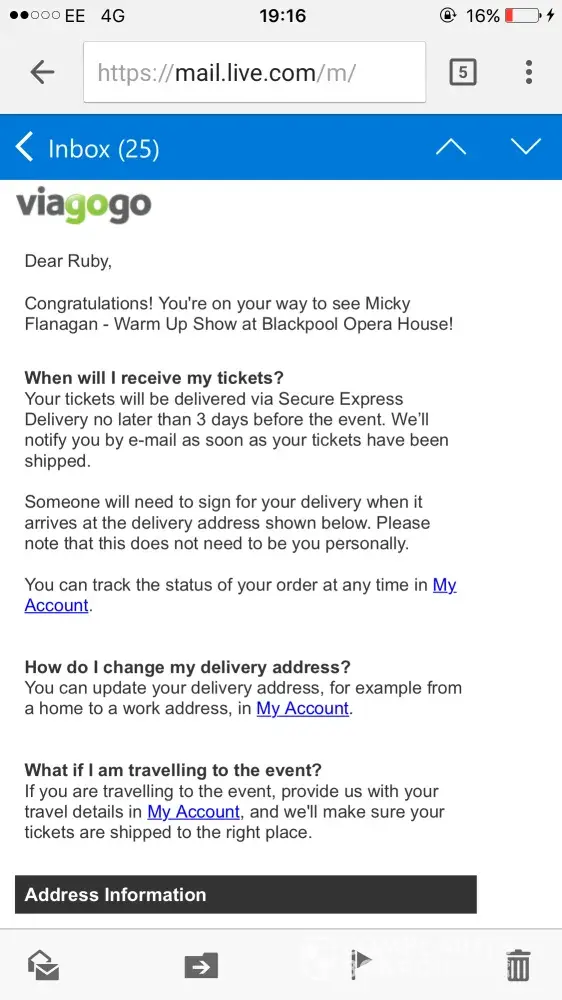 I order tickets and paid for them when putting in delivery address I put the wrong house number which I didn't realise I had done until I received email to say they had been shipped. The house number isn't valid so the tickets have been sent bk to viagogo I know this as I went down to local post office and they say u revived them Monday ! I have been trying to contact someone for 3 days on the numbers I was provided via the website I am unable to talk to someone reguarding my issue