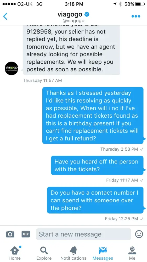 I ordered 3 tickets from the website www.Viagogo.com. I didn’t like the services at all, because the seller promised to deliver them within 5 days. And every day he called me and told blah-blah and empty promises. I told to stop it and return money. This scammer told to come to some unknown for me place and he would be there. I came, but he didn’t. After that no money and no tickets. ###. I wonder if there are other people, who had the same experience. Can you provide any good piece of advice?