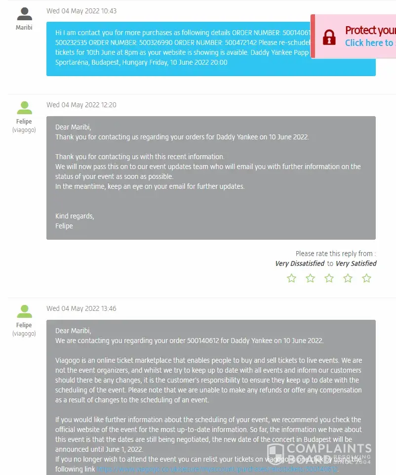 Curiously - the day after our complains - Viagogo changed the naming of the event, removing "Daddy Yankee" and replacing it with another artist's name (second screenshot attached to my complain here).