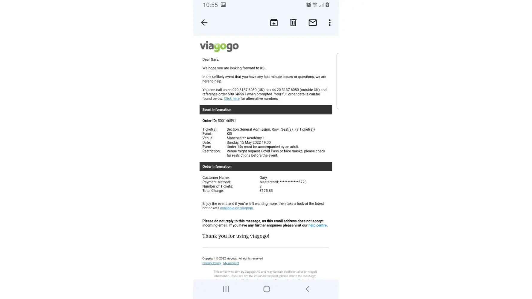 We called customer services over and over again in the ensuing days. With less than 48 hours before the start of the event, Viagogo wrote to say the sum paid on my credit card would be refunded in full as they had been unable to provide the tickets purchased nor any replacement. Panicked and distraught as this had been a special birthday gift, we scoured around friends to find alternative tickets, which we did and purchased. Several hours later Viagogo wrote to say that passes (using a completely new order ID about which we knew nothing) were being shipped. Viagogo made no contact to ask if the passes were still needed or to alert us that they were creating a new order. We immediately called Viagogo to alert them to the problem and I wrote to customer services attaching the written notification of the refund, outlining that we had made alternative arrangements as a result and therefore no longer needed the passes . I received no response to this email.