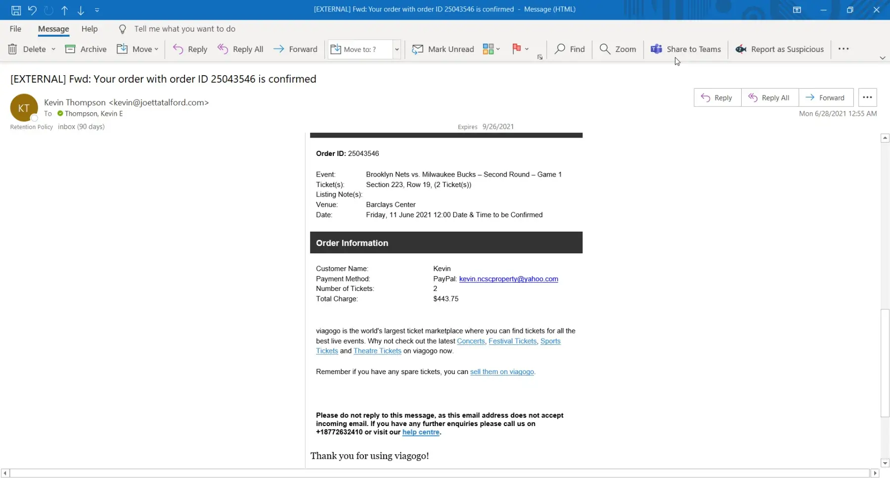 I purchase NBA tickets to see Brooklyn Nets and the Milwaukee Bucks onJune 11, 20021 that was posted on Viagogo's website ticket # [protected]. After I paid for the tickets($443.75), bought plane tickets and made hotel accommodation, I received another email saying my transaction was cancelled. I later found out the game was actually June 5, 2021 instead of June 11th. Viagogo refused to return my money even after I've sent them the confirmation email they sent me for the June 11th game.