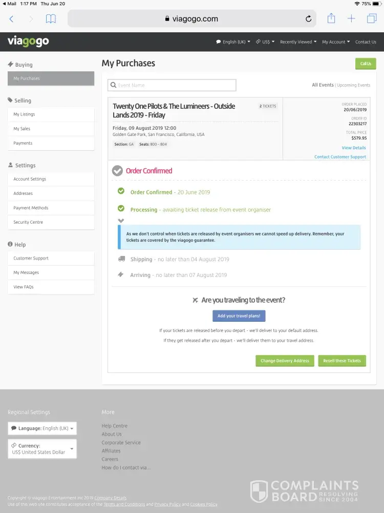 I bought two tickets for tonight's Elton John concert in Perth, WA via Viagogo. The tickets have not been delivered yet. Transaction on credit card on 18/11/19 showed that Viagogo deducted the cost of the tickets ( A$283.63), but never forwarded them.