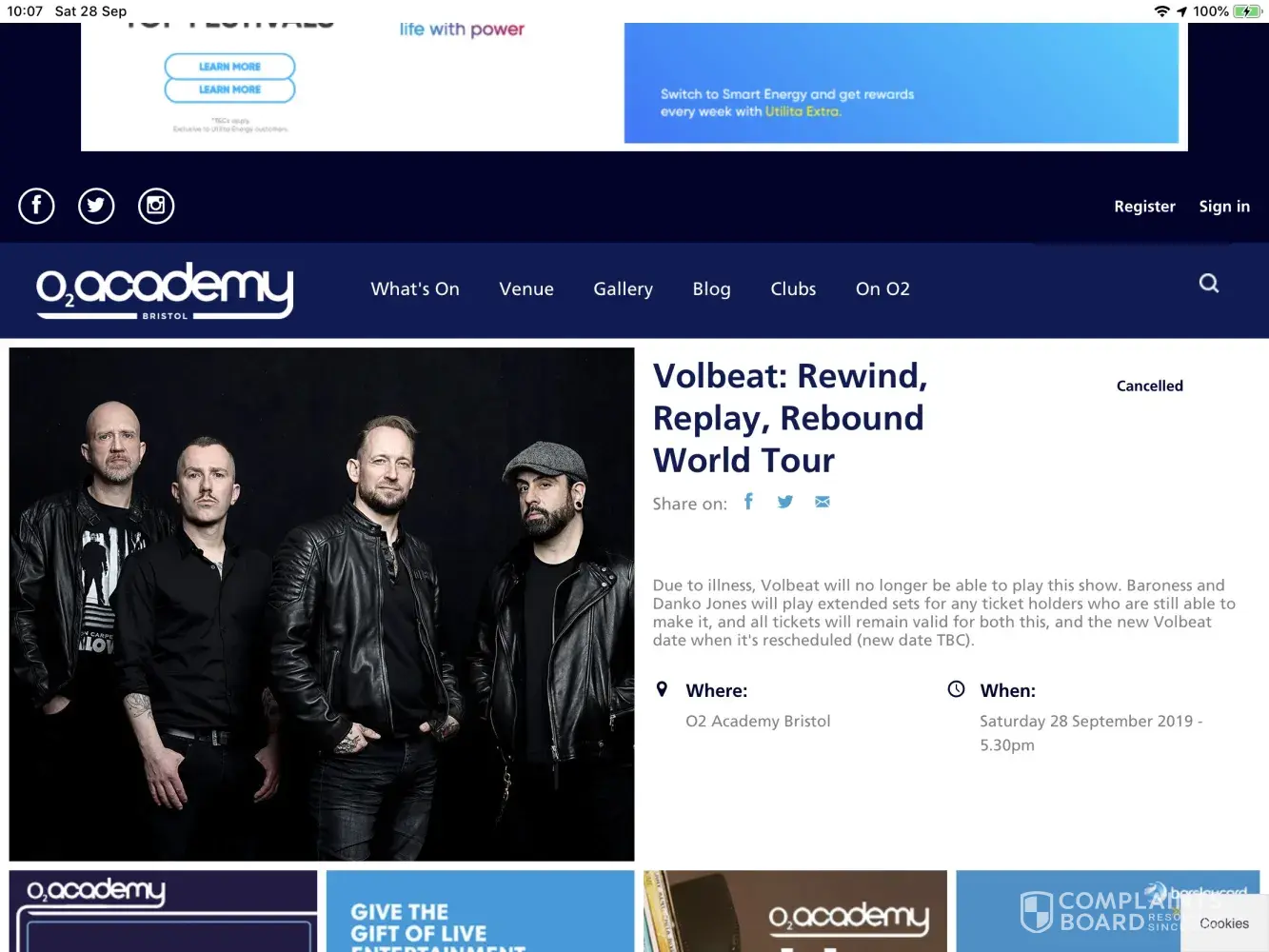 The issue that I have experienced was: on 28th September 2019 at the Bristol O2 Academy the voltbeat tour was cancelled .