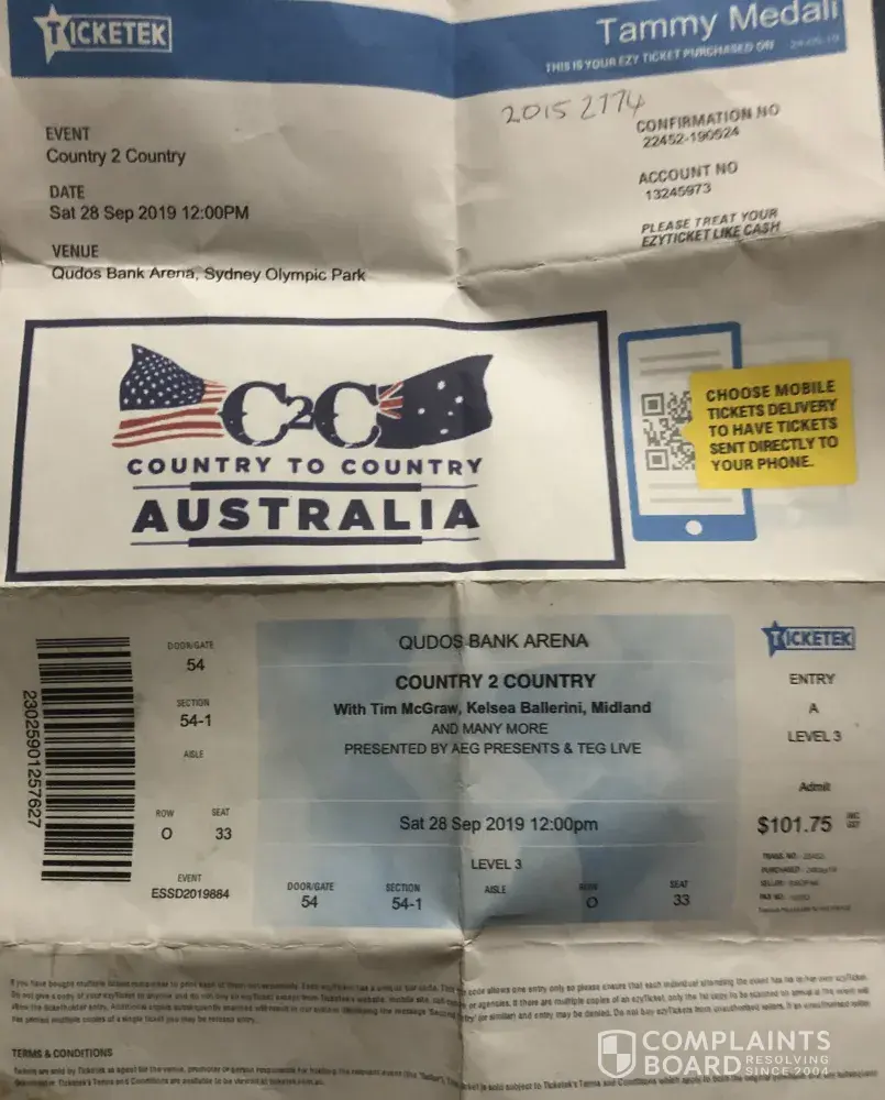 I purchased tickets to the Tim McGraw COUNTRY 2 COUNTRY concert paid $950 for 2 tickets. When purchasing the tickets I was led to believe the seats were the last tickets available and where in the first elevation area 5 but when issued they in elevation 3 very last roof near roof with a face value of $101.75 ea