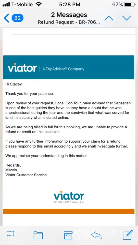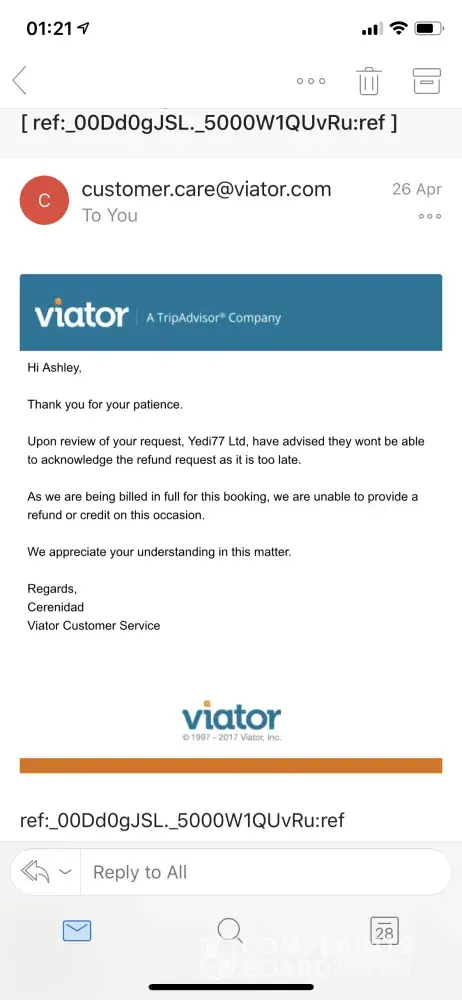 In a very strong message to Viator, I say, "an absolute shameful way to treat a client who has previously had faith in their business, which so boldly boasts of being …… "A TripAdvisor Company".