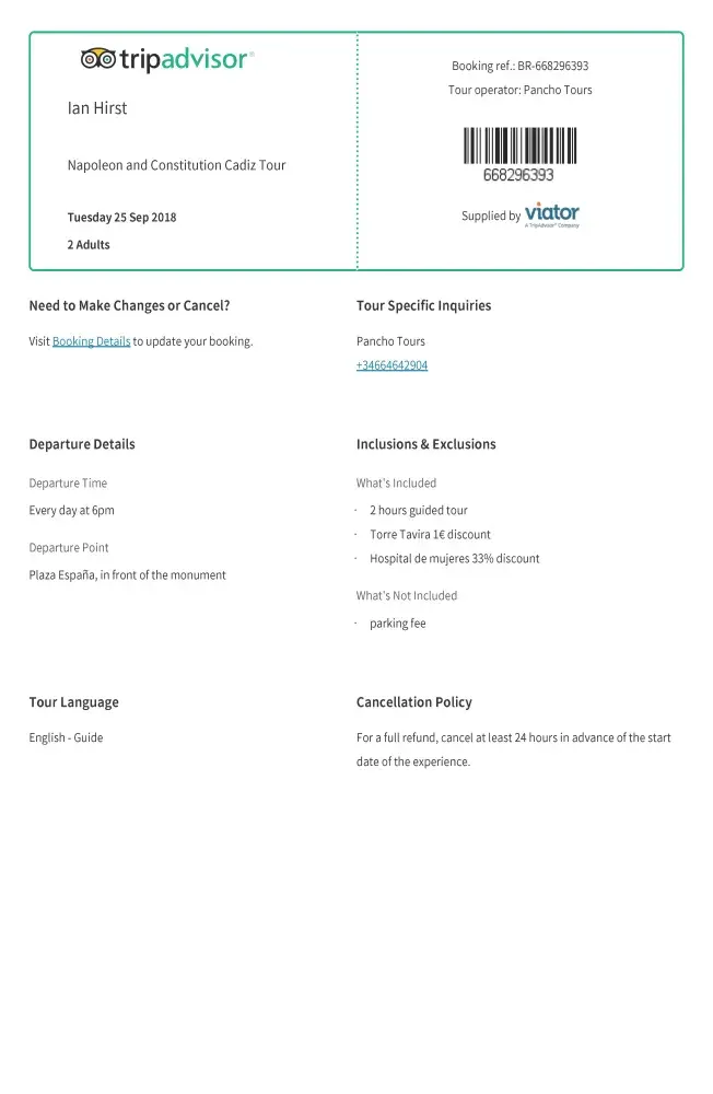 Apart from this occurrence we have had an amazing trip and have really enjoyed your city and have been made extremely welcome by everyone we have met in Cadiz (including tourist information) and are looking forward to coming back to look at everything we did not have time to see.