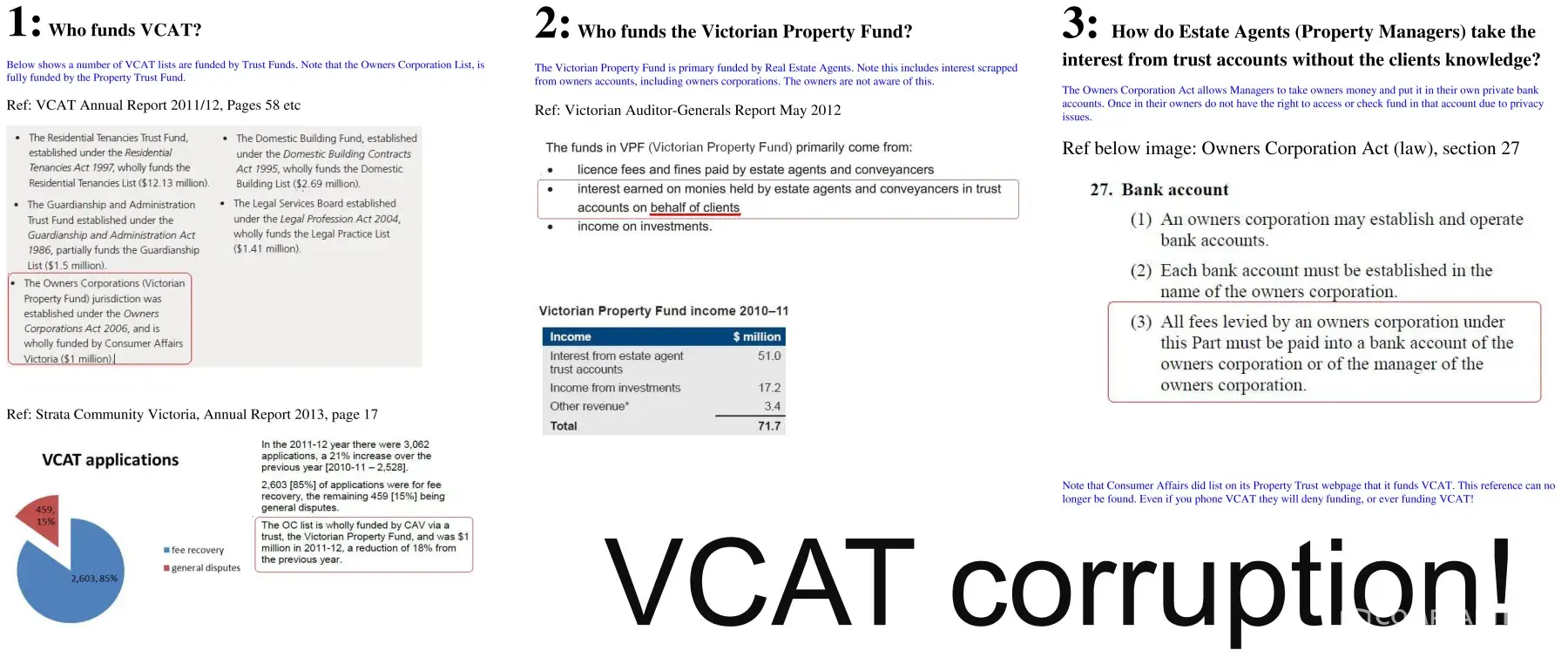 Fact 6 From the owners pooled money, managers take the interest and pay it to the Victorian Property Fund. From this fund more than a million is paid to VCAT yearly. It wholly funds VCAT’s OC list (Eg: SCA Annual Report AGM 2014 page 18. VCAT Annual Report page 53).