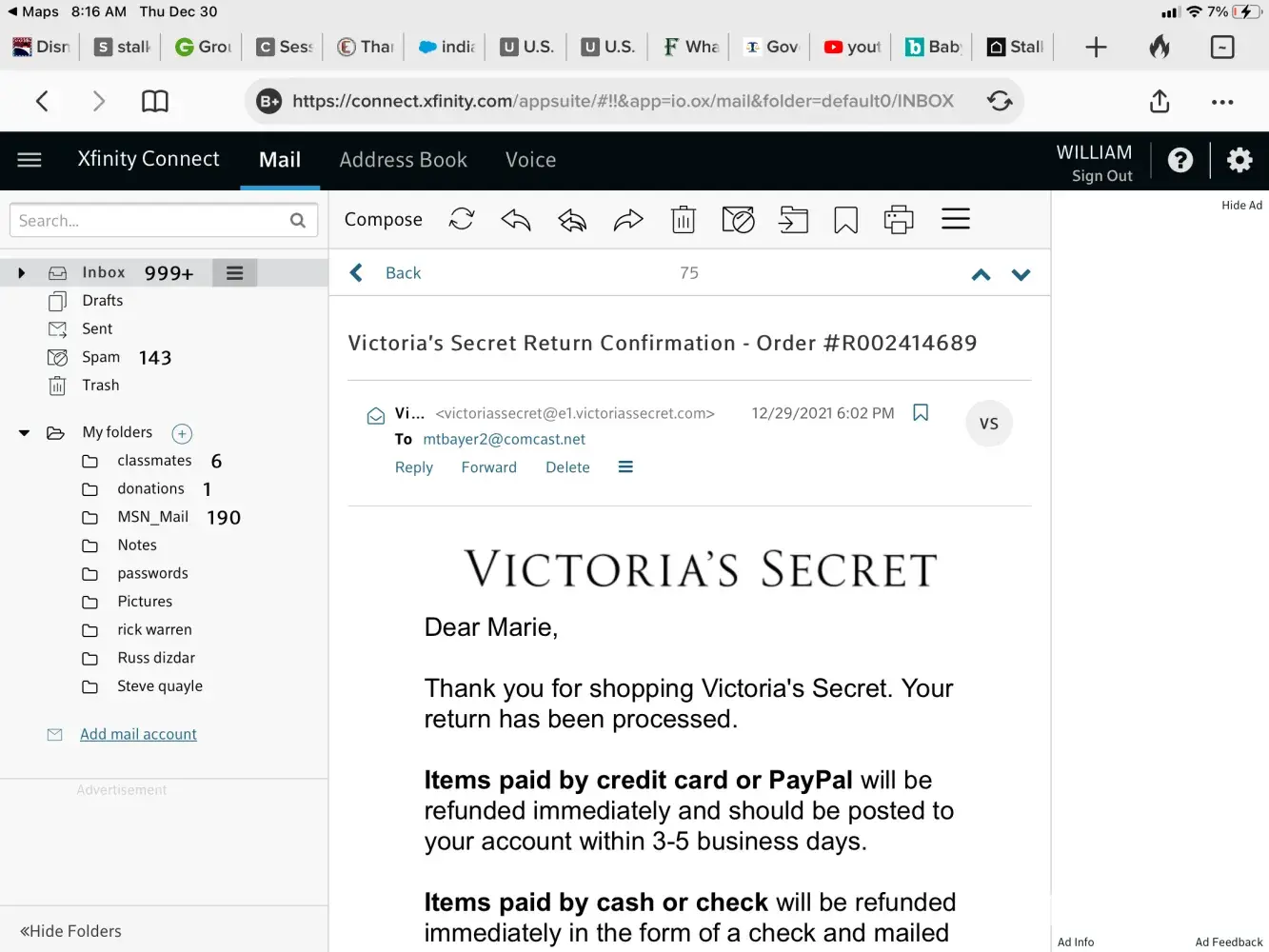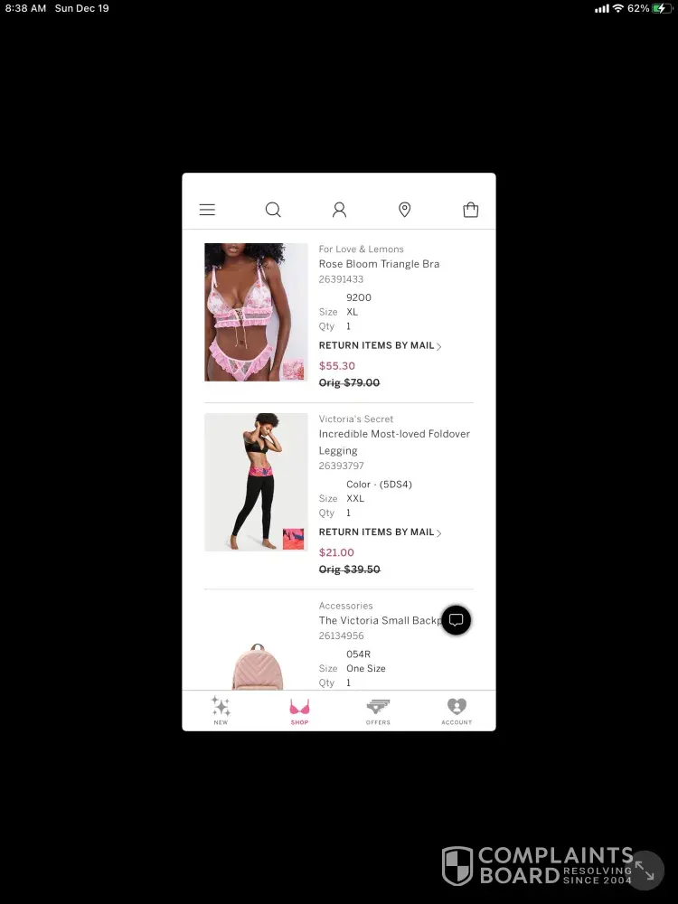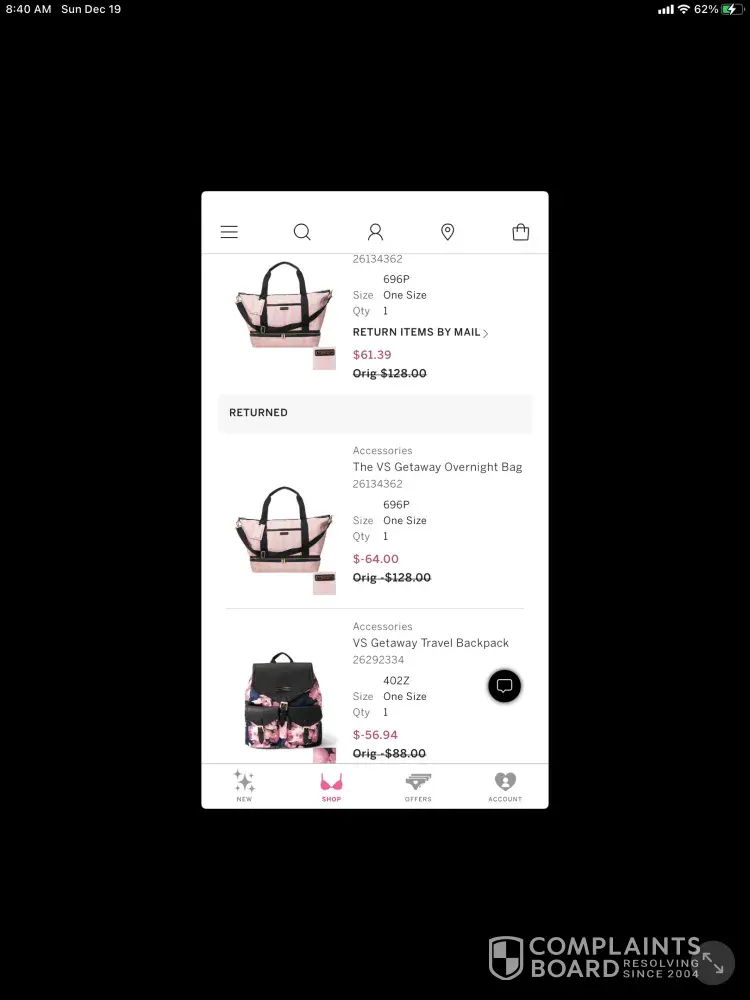 1. I ordered a few swimsuit pieces & SWIM through your online catalog, to my surprise none of them fit, even though I used your online sizing chart and measured myself before placing my order. Nothing fit upon delivery, which I returned immediately via mail. I printed out my own return labels from my home, using my computer and ink expenses. I was immediately greeted with a bill, and a past due amount from Victoria Secret. How could that be? I JUST returned the merchandise that I had recieved...
