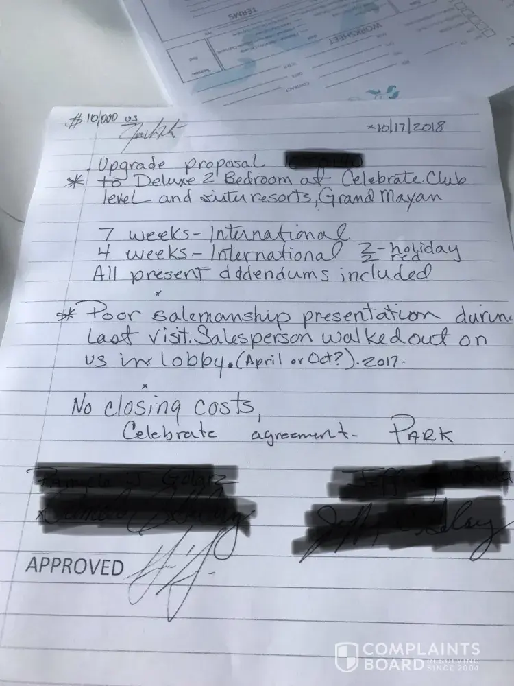Shook My hand and written offer was stamped approved and initialed. He came back with documents to sign and was not as was approved. I bedroom instead of 2 bedroom deluxe at Celebrate Club All addendums as previous contract. 7 weeks- 2 red, 2 holiday 4 international weeks When I questioned this I was told I was wrong by Another person, manager.